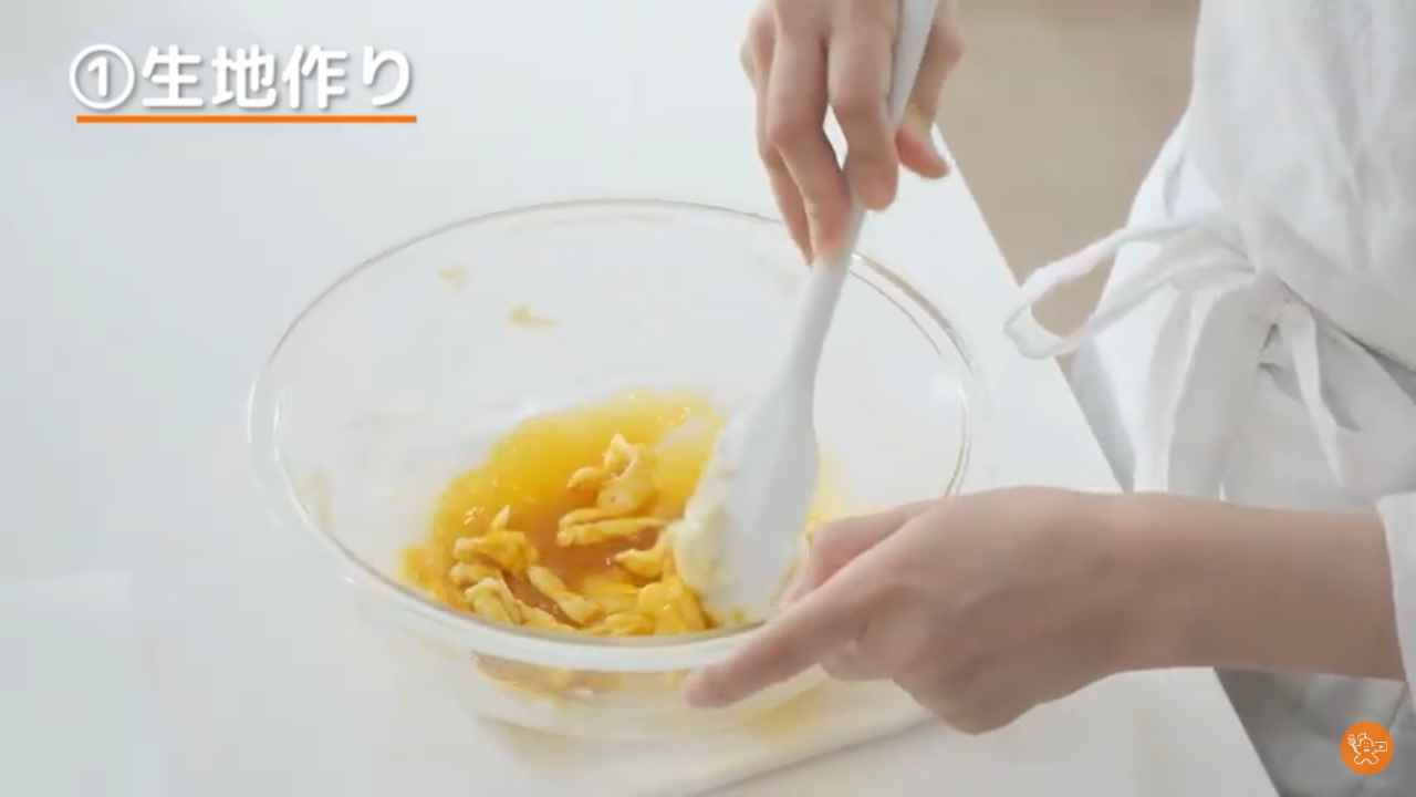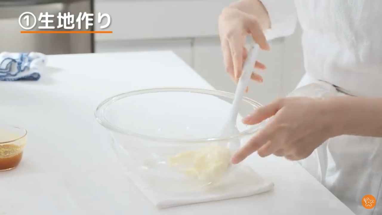 バター(60g)をボウルに入れ、ゴムベラでマヨネーズ状になるまで練る。- 2