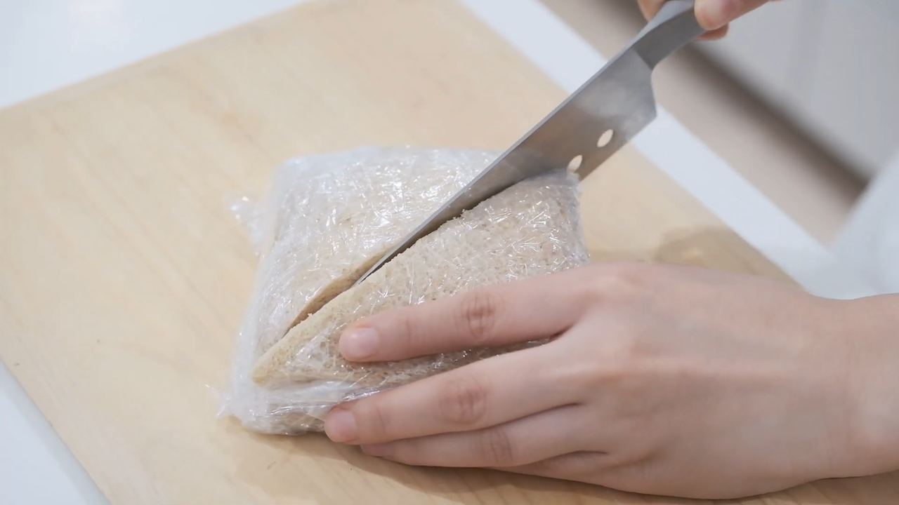 冷蔵庫から出して、ラップのまま半分にカットする。- 2