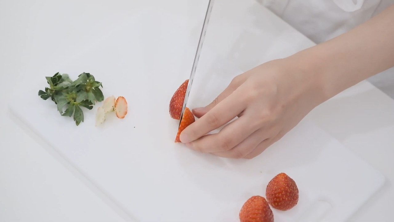 いちごのヘタを取って洗い、1粒だけ半分にカットする。- 3