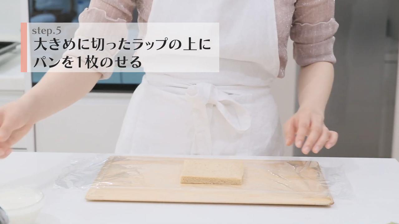 大きめに切ったラップの上にパンを1枚のせる。- 2