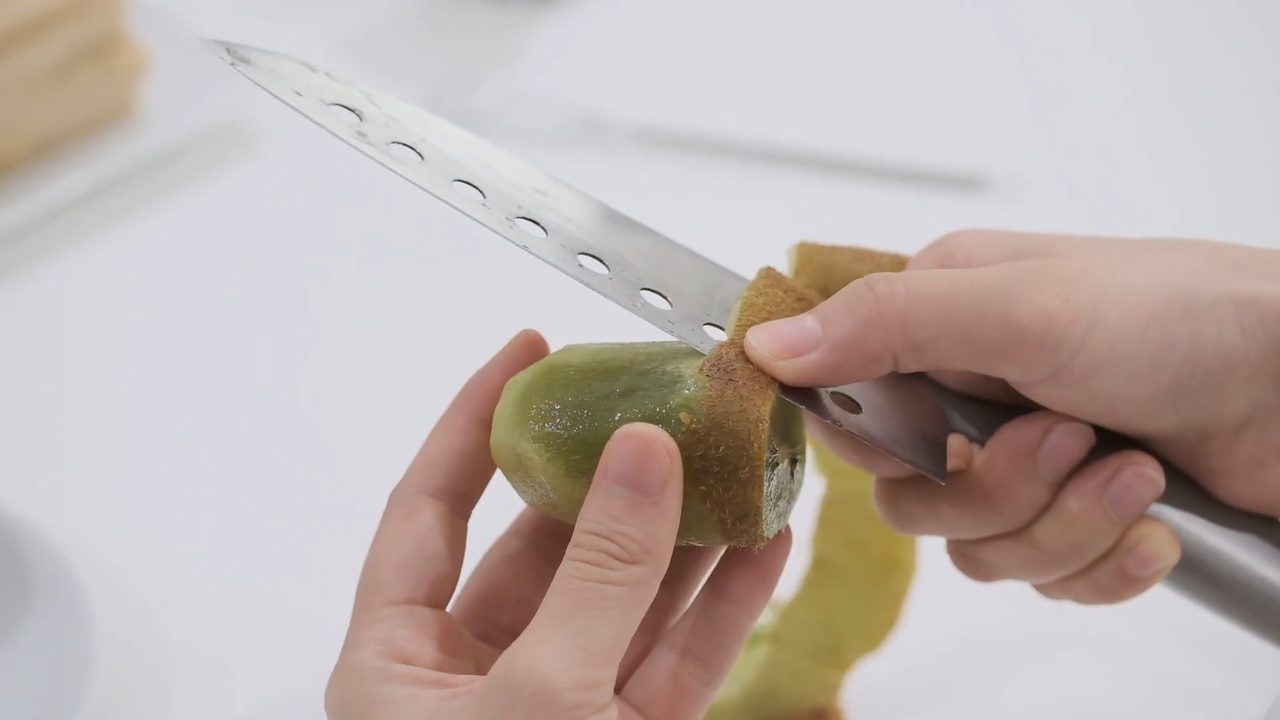 キウイは洗って両端を取り除き、皮をむく。カットしたフルーツを冷蔵庫で冷やす。