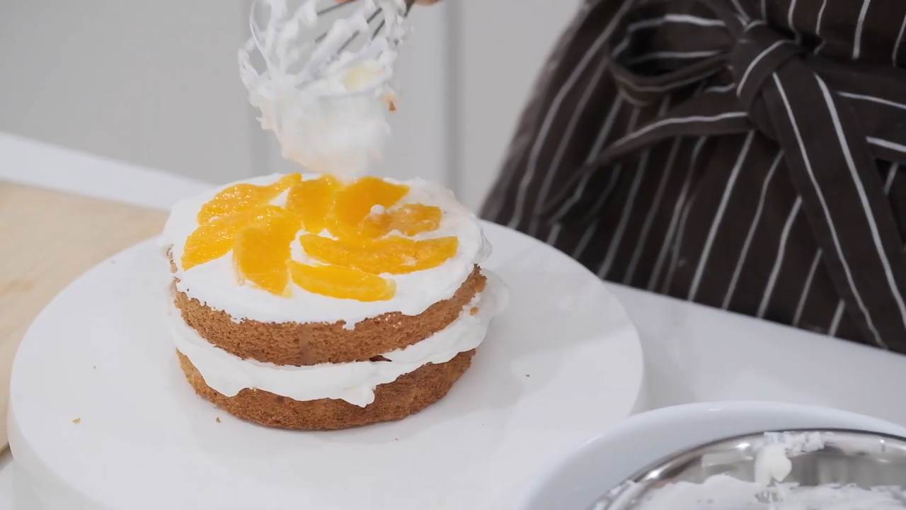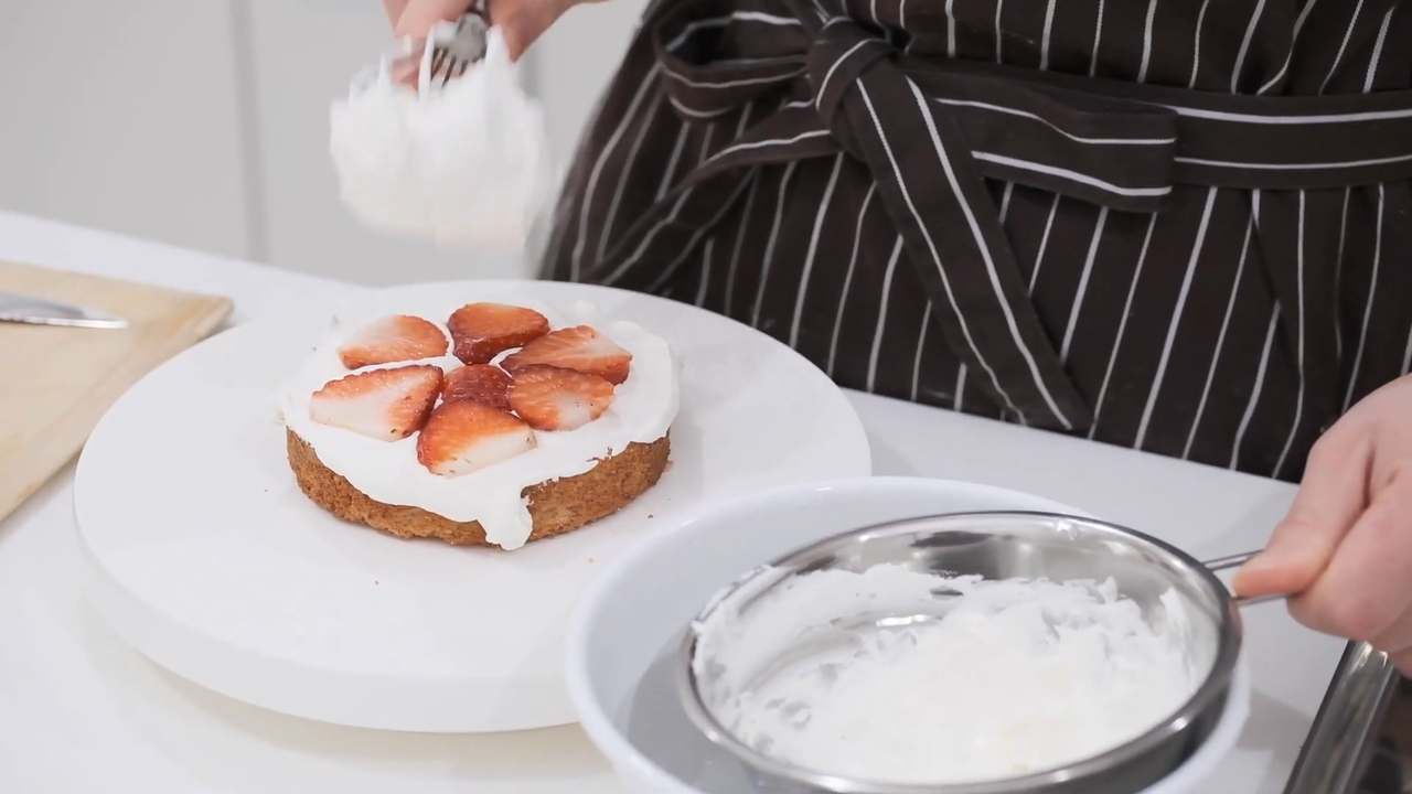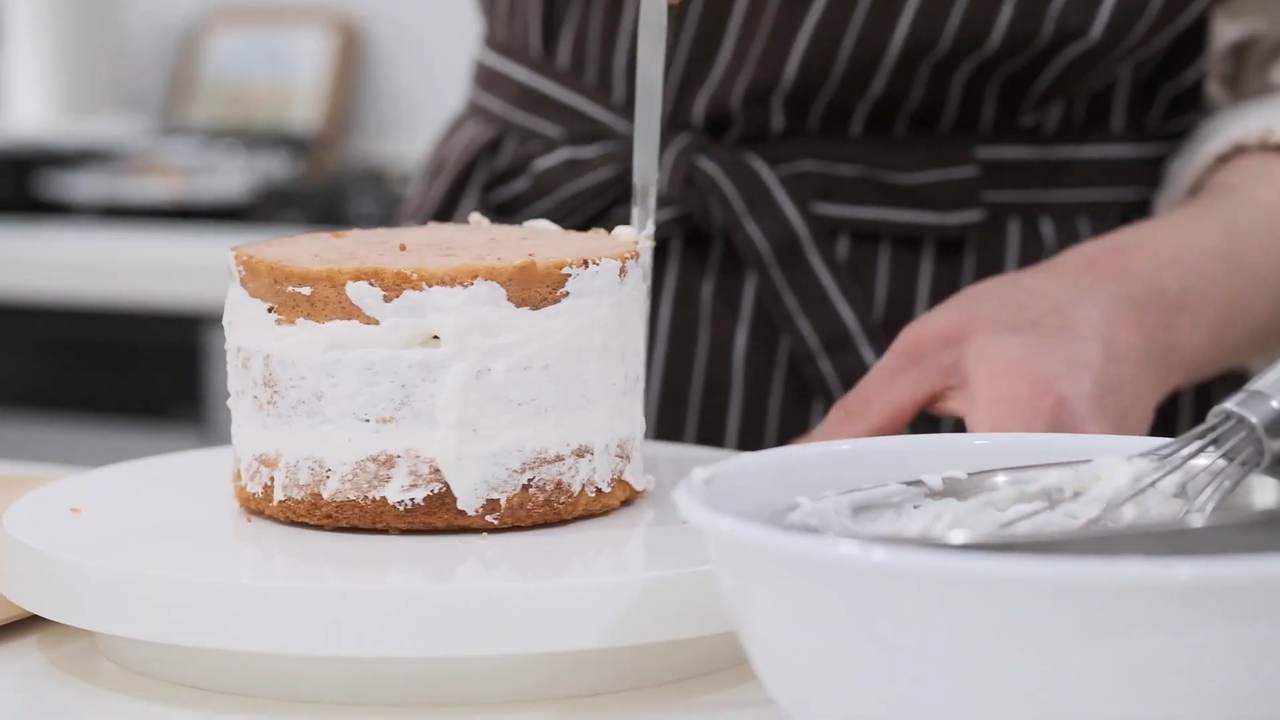 ジェノワーズをのせ、はみ出したクリームを側面に塗り広げる。- 5