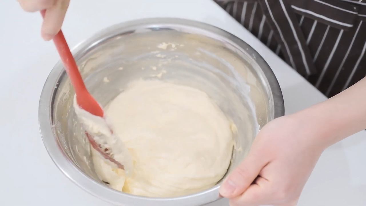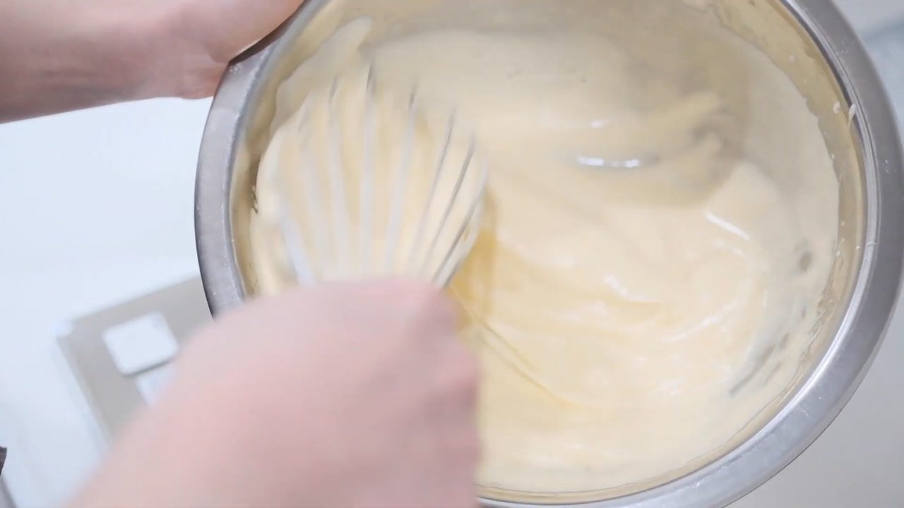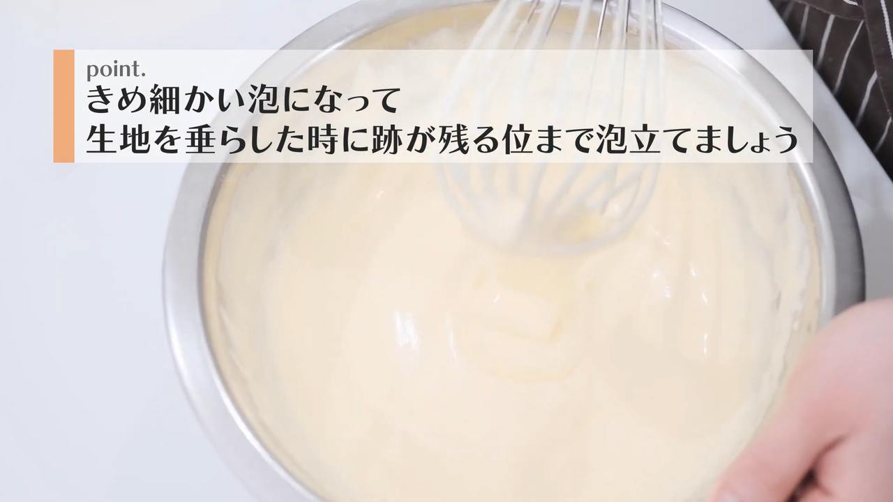 生地がきめ細かい泡になって生地を垂らした時に跡が残る位まで泡立てる。- 4