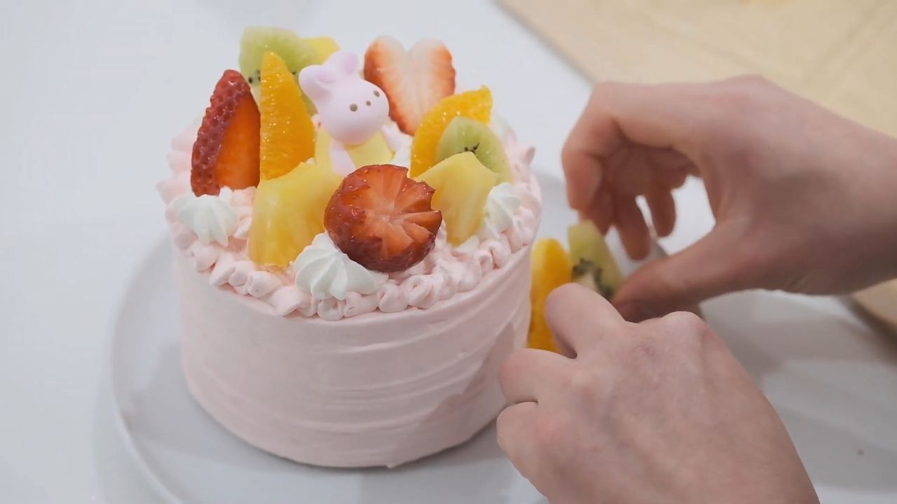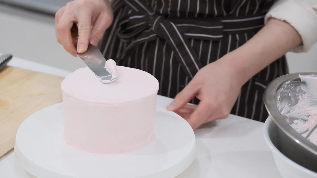 残りのクリーム(60g位)に色粉を加えてピンク色のクリームを作り、全体にナッペする。- 6