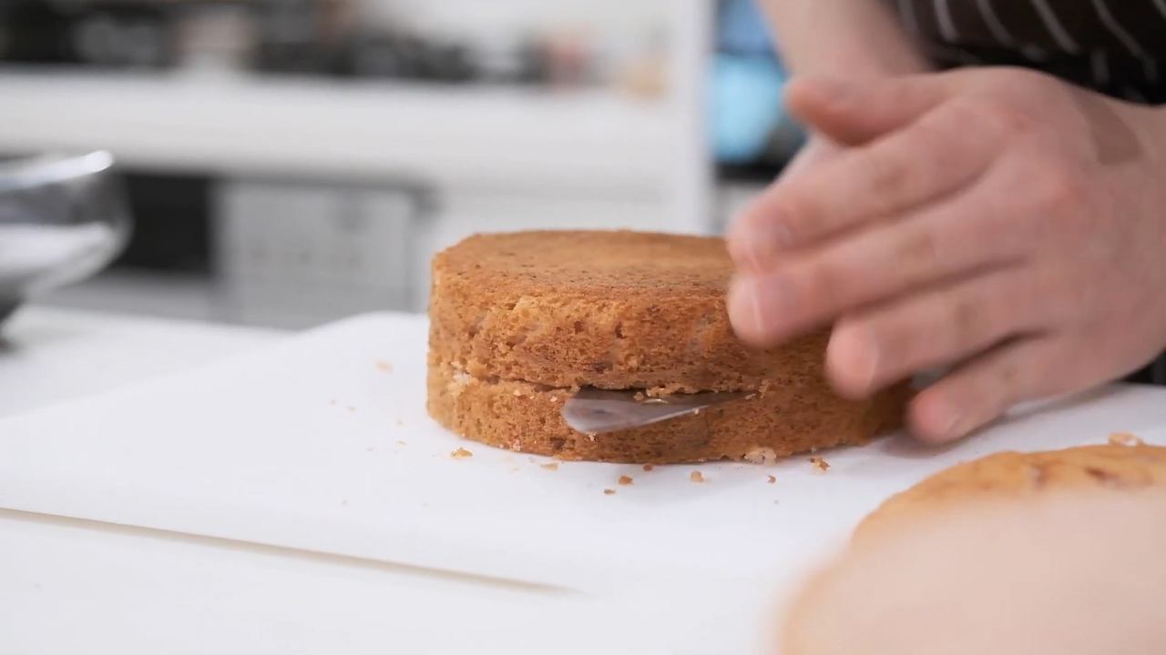 ジェノワーズの上面をカットし、3枚にスライスする。- 2