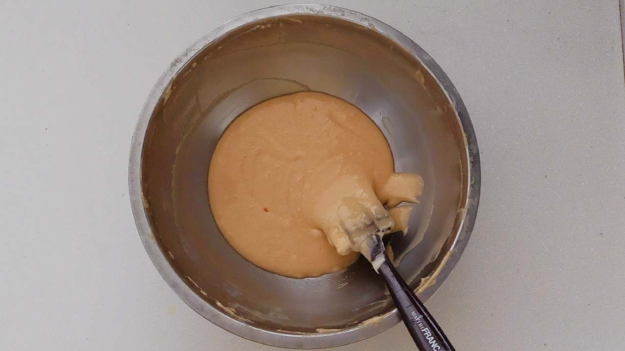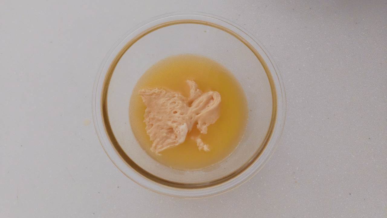 バターをレンジで人肌程度に温めます。温めたバターに⑥の生地を少量(ヘラで一度に救える程度)を加えてしっかりと混ぜ合わせます。大切な工程なので、分離していないか注意してください。- 8