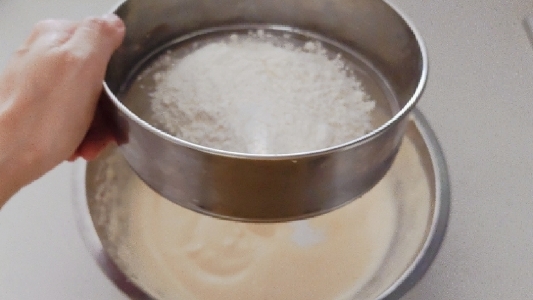 ④に、薄力粉・ベーキングパウダーをふるいにかけながら加えていきます。- 6