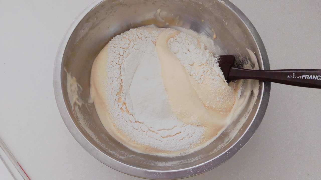 ⑦を⑥の残りの生地に加えて、全体を混ぜ合わせます。生地がほぼ均一に混ざったらOKです。しかし混ぜすぎには注意してください。- 9