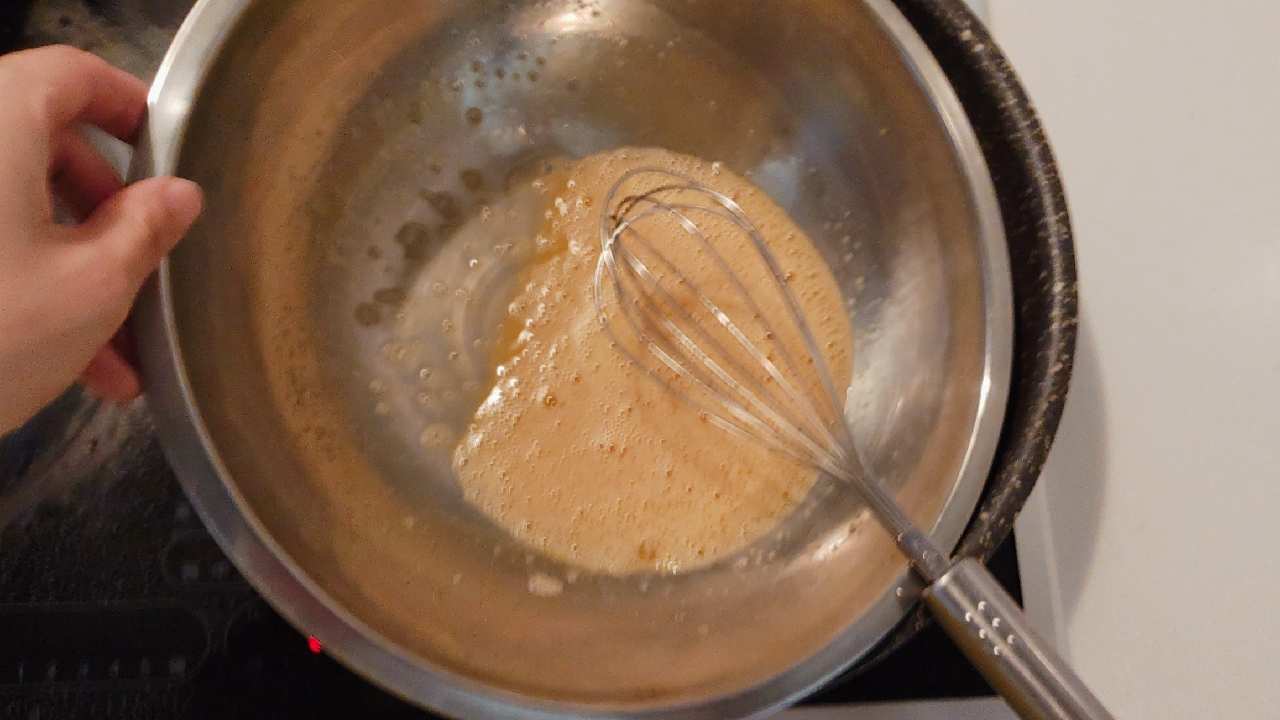 砂糖を加えたら、湯煎にかけて混ぜ合わせます。湯は人肌程度の温度で保ってください。- 3