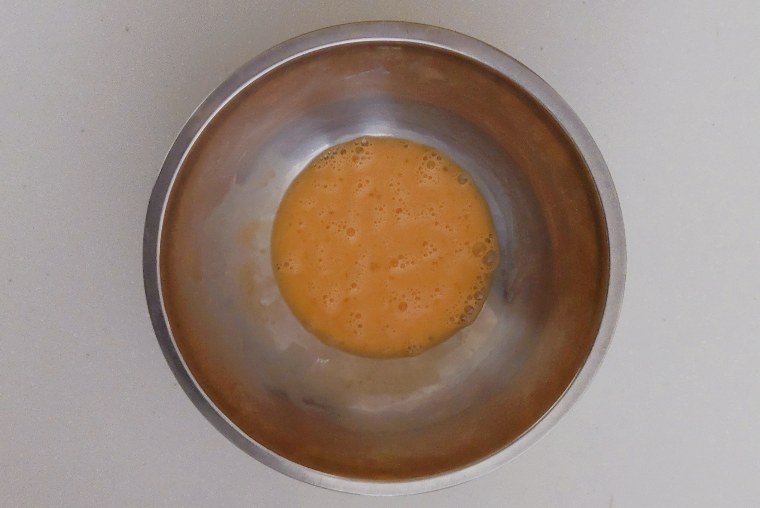 ボウルに全卵を割り、泡立て器で混ぜます。- 2