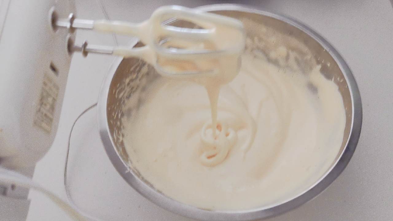 ボウルを斜めに傾けて、クリームにふわっとボリュームが出るまで泡立てます。ハンドミキサーを持ち上げたときに、クリームのあとが残る程度の固さになればOKです。- 5