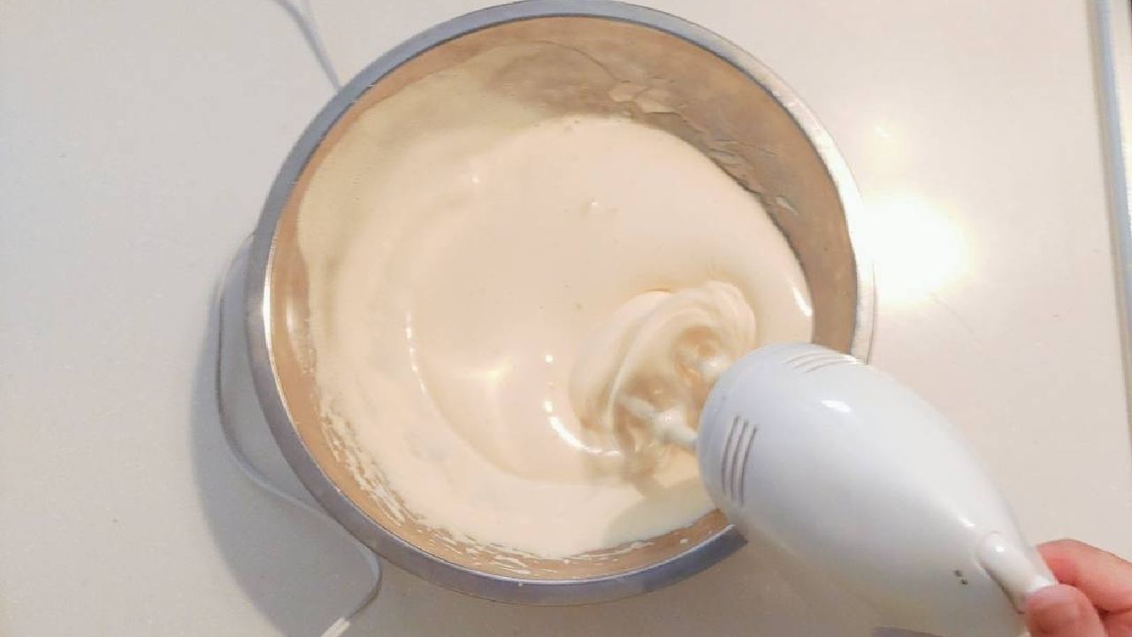 砂糖が溶けたら、湯煎から外してハンドミキサーで泡立てていきます。- 4