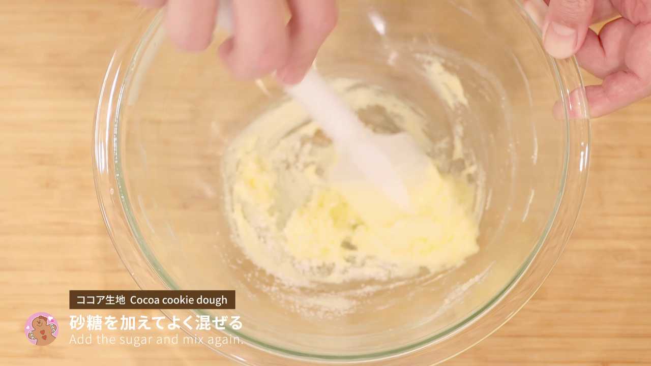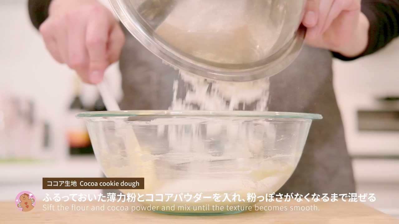 ふるっておいた薄力粉とココアパウダーを入れ、粉っぽさがなくなるまで混ぜる- 6