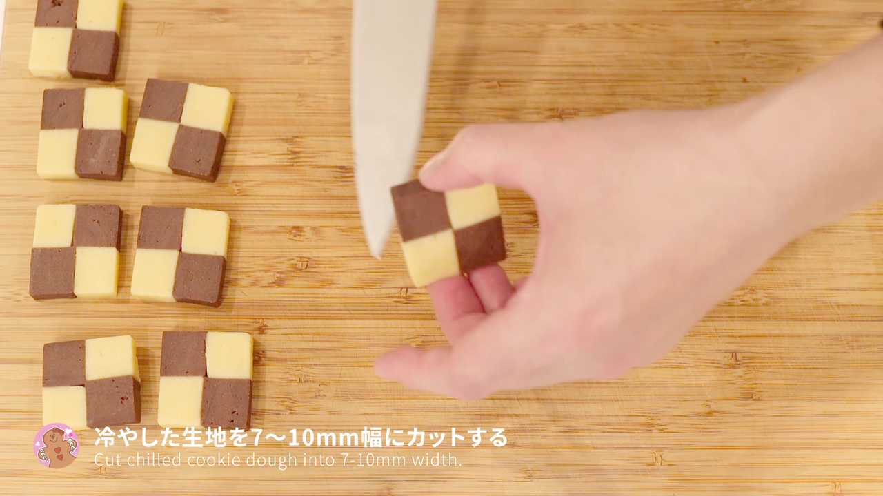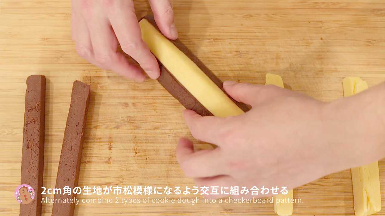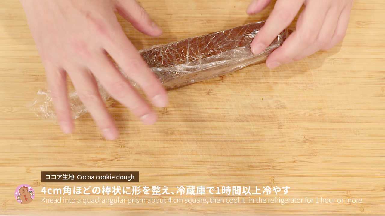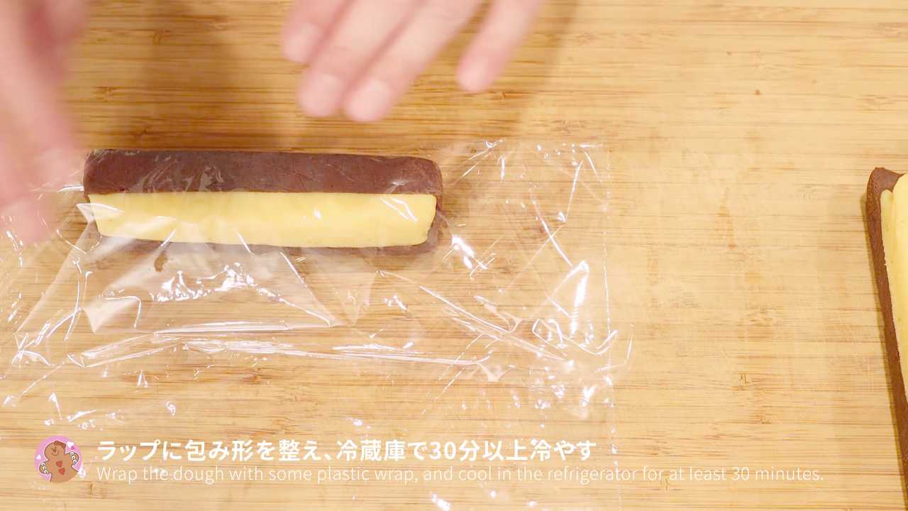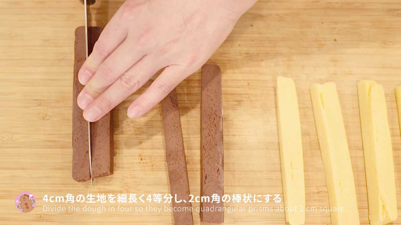 プレーン・ココア生地ともに4cm角ほどの棒状に形を整え、冷蔵庫で1時間以上冷やす- 2