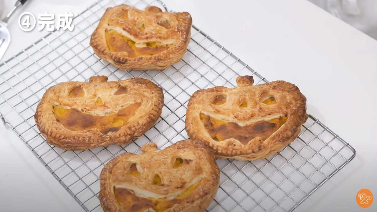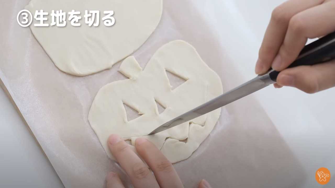 パイシートを2等分して、(A)ジャック・オー・ランタンの顔にくり抜いたものを4つ、(B)かぼちゃの形を4つ作る。