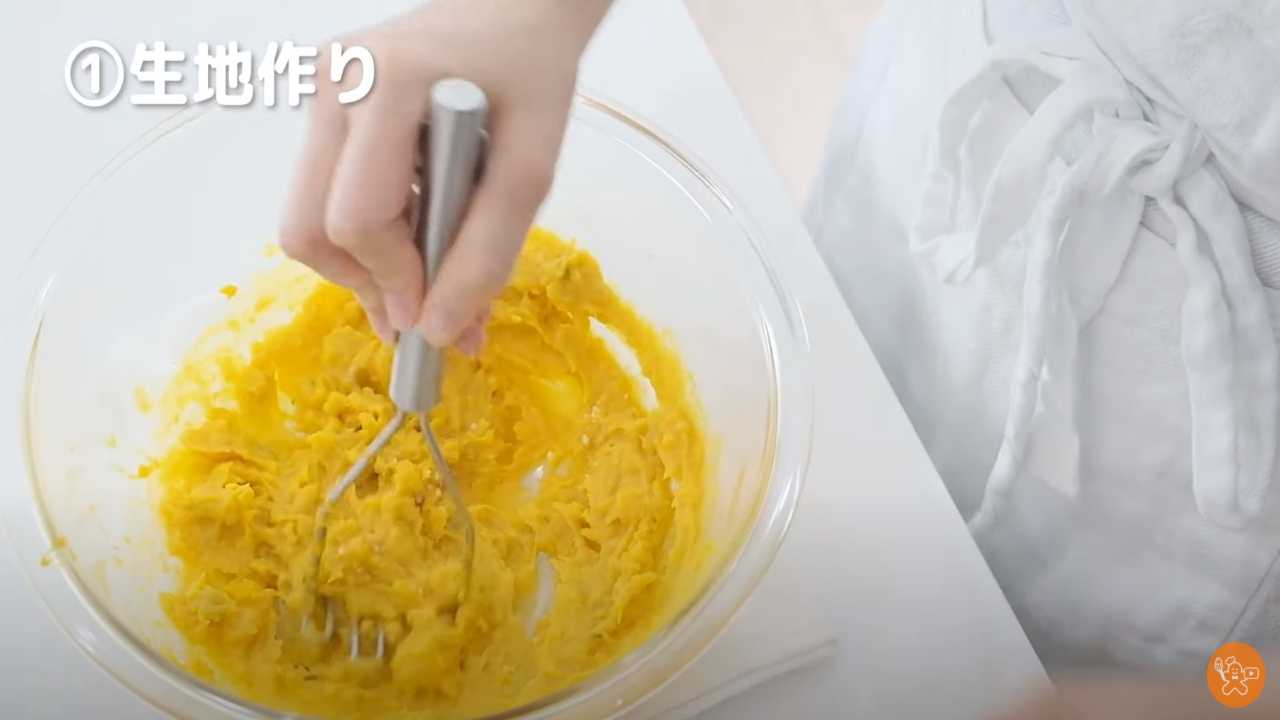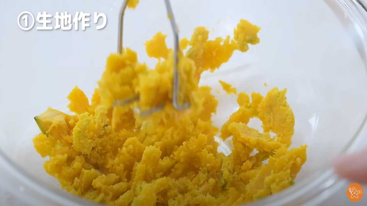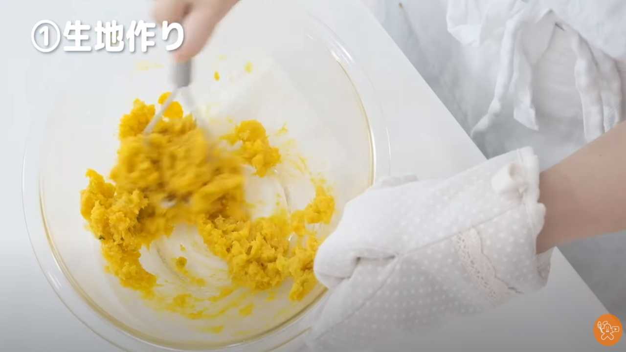 かぼちゃが入ったボウルに生クリームと砂糖を加えて混ぜる。- 4