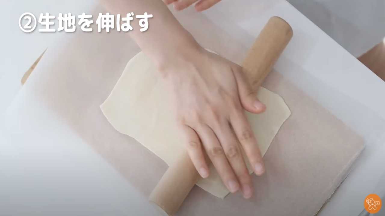 オーブンシートの上にパイシートをのせて、麺棒で薄めに伸ばす。- 2