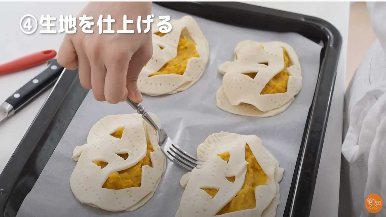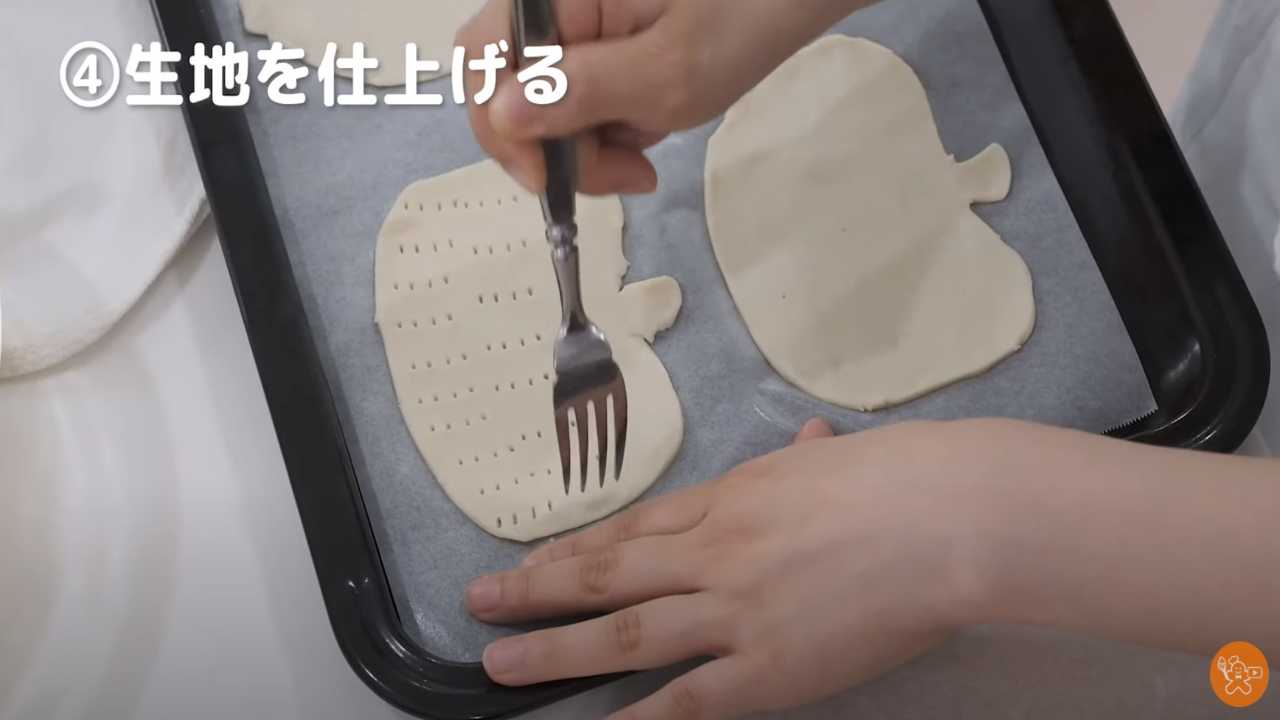 (A)のパイシートを上にかぶせ、縁をフォークで押さえて接着する。- 4