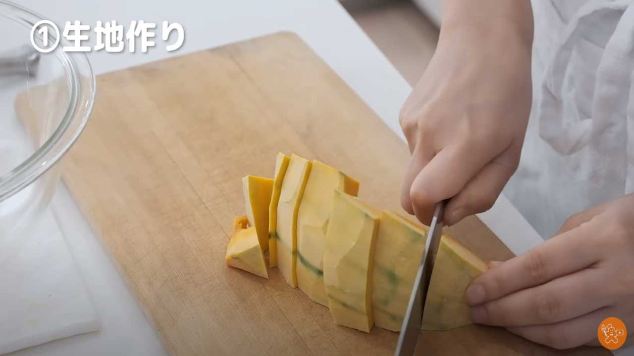 かぼちゃの皮を取り、ひと口大に切る。- 4