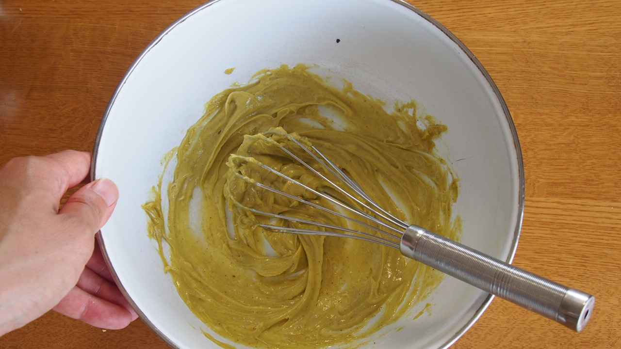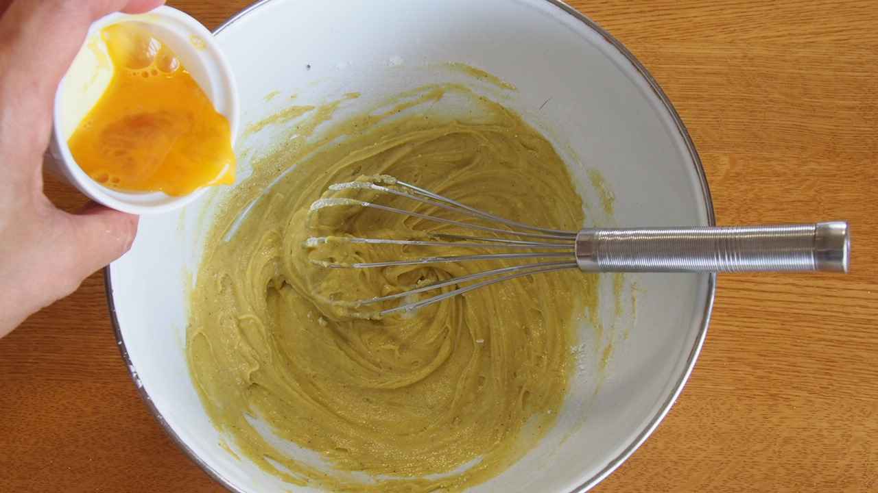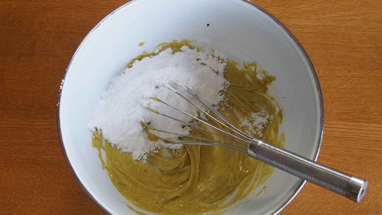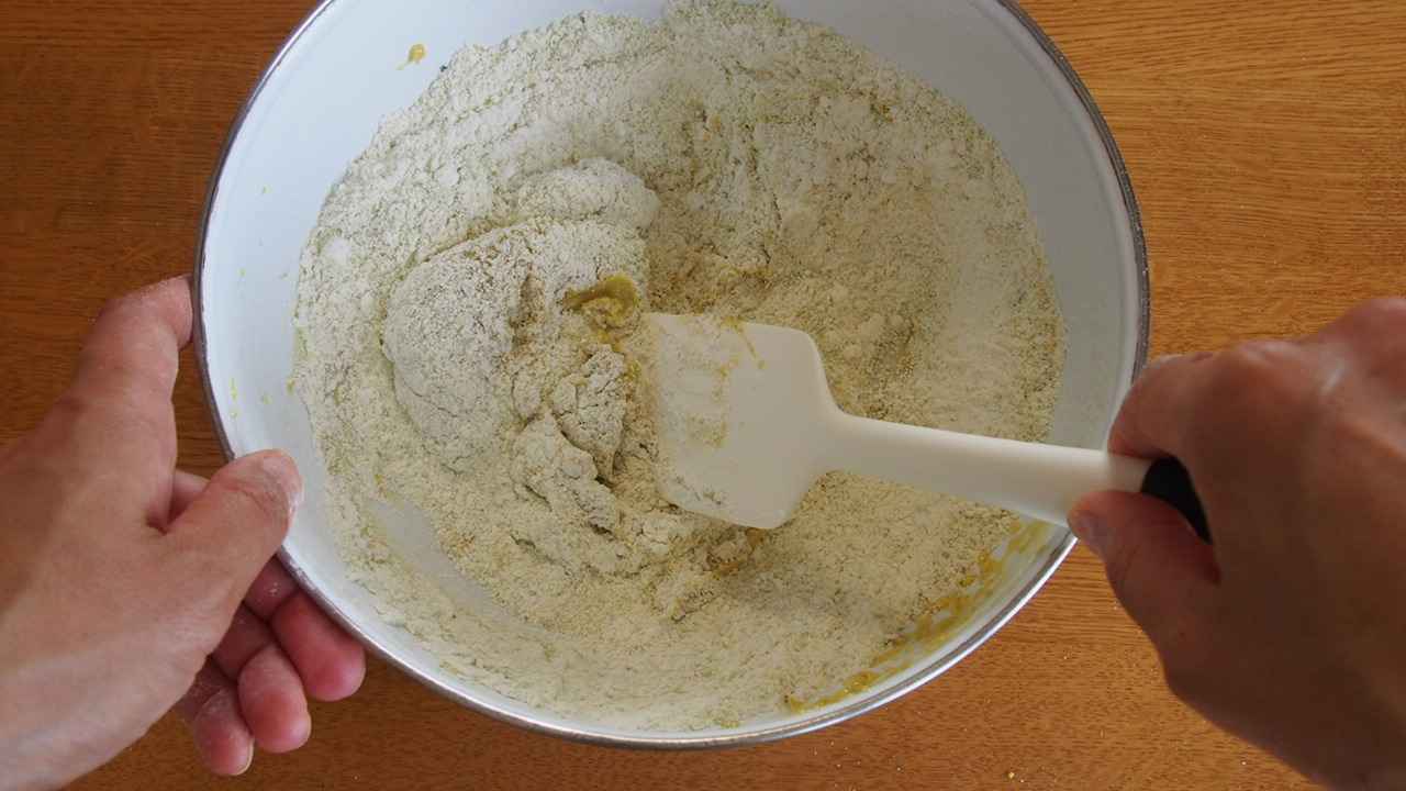 ふるった薄力粉とピスタチオパウダー、アーモンドプードルを混ぜる。