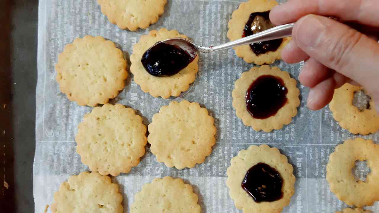 クッキー生地がしけらないようにするため、ジャムを少し温めて、水分を飛ばしてからクッキー生地に乗せ、サンドする。
