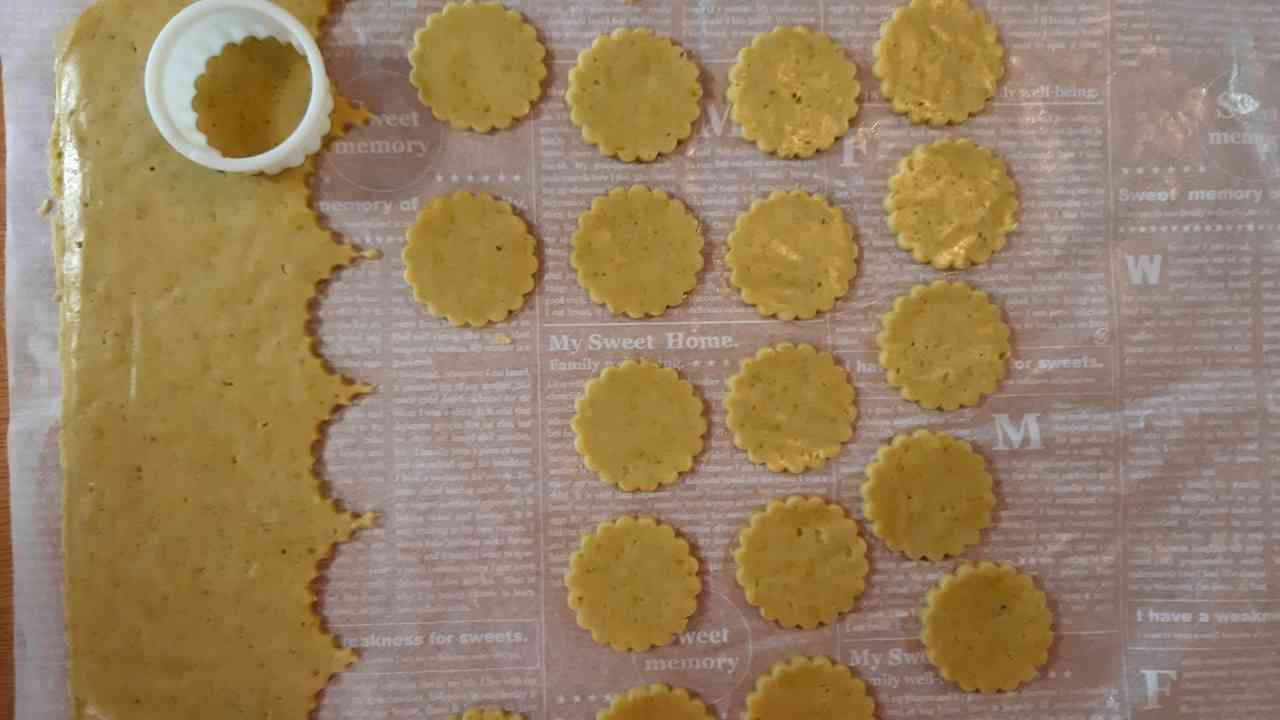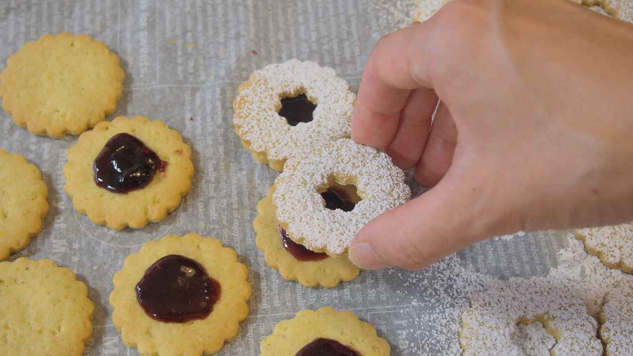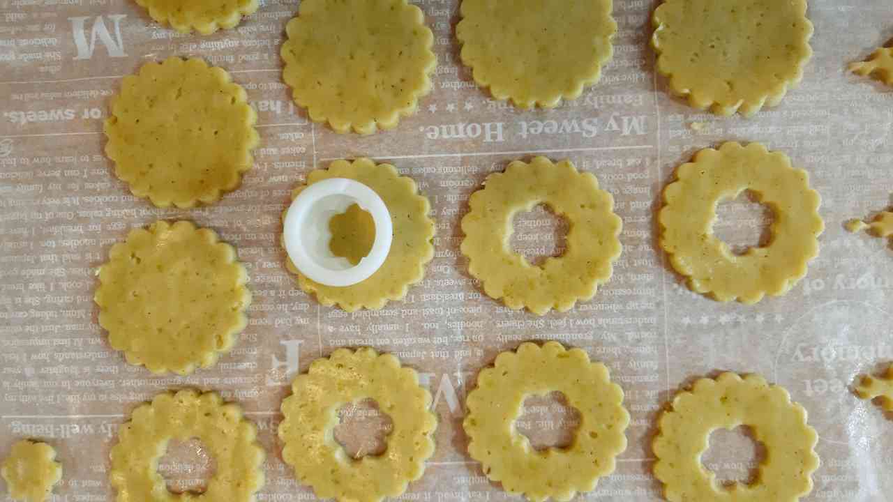 サンドした後でジャムの色が見えるように二回りほど小さな型で抜いておく。