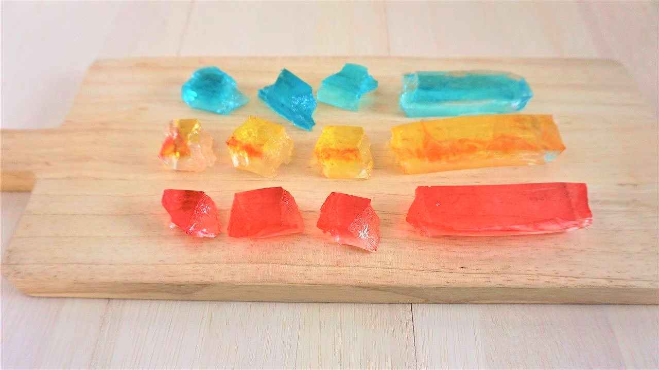 そのキラキラした甘い宝石は、実は和菓子で『寒天・砂糖・色素』の3つからできており、外はカリカリで、中はゼリーのようにプルンとした不思議な食感です。