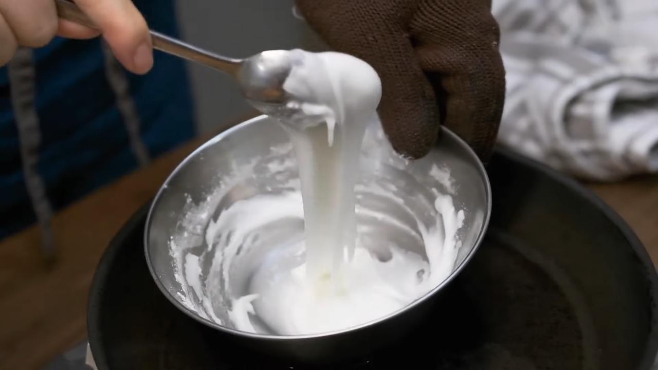 粉糖にレモン果汁を加えて、湯煎にかけながら混ぜる。- 2