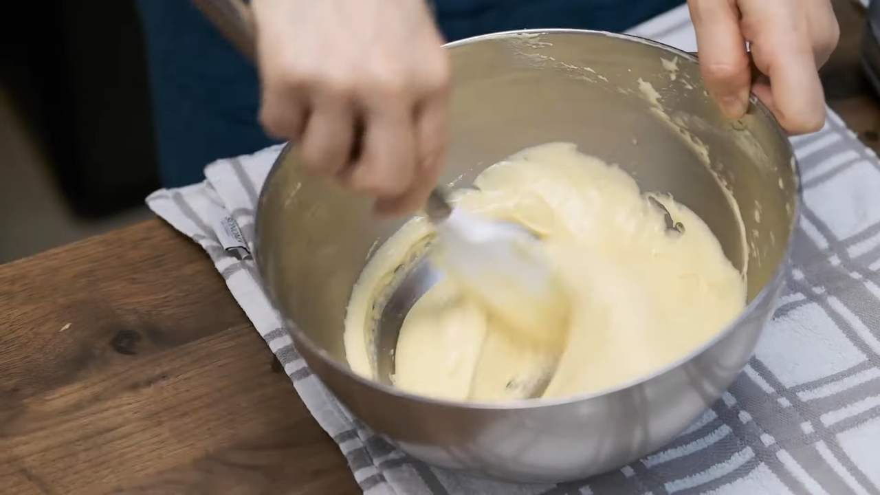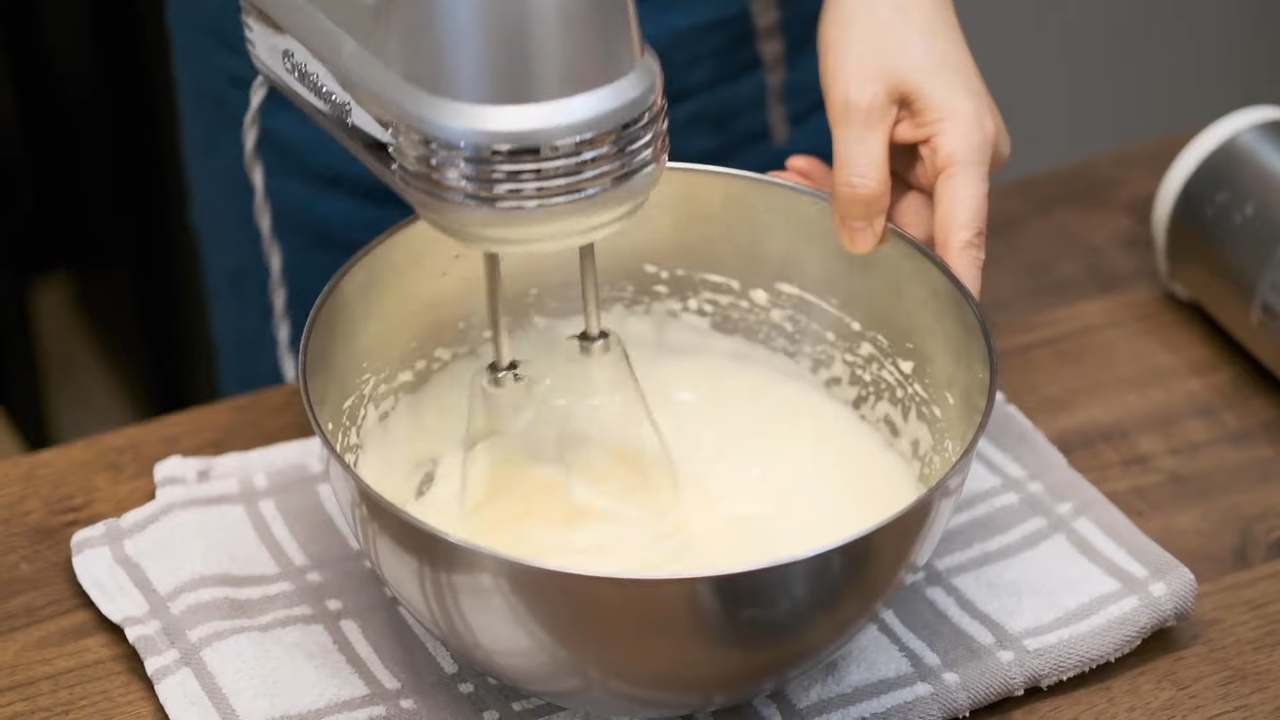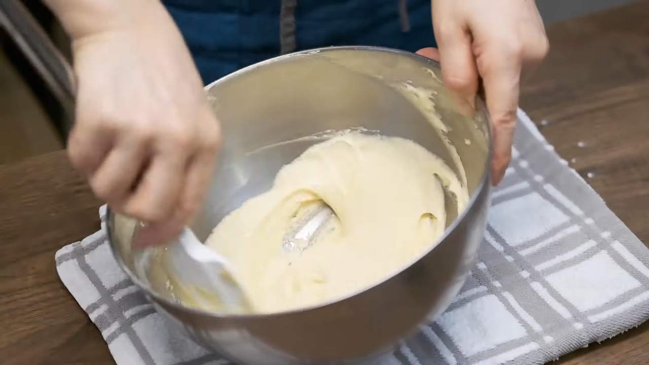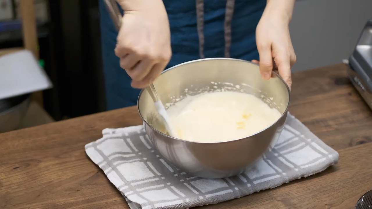 薄力粉を3回に分けてふるい入れ、その都度よく混ぜる。- 4