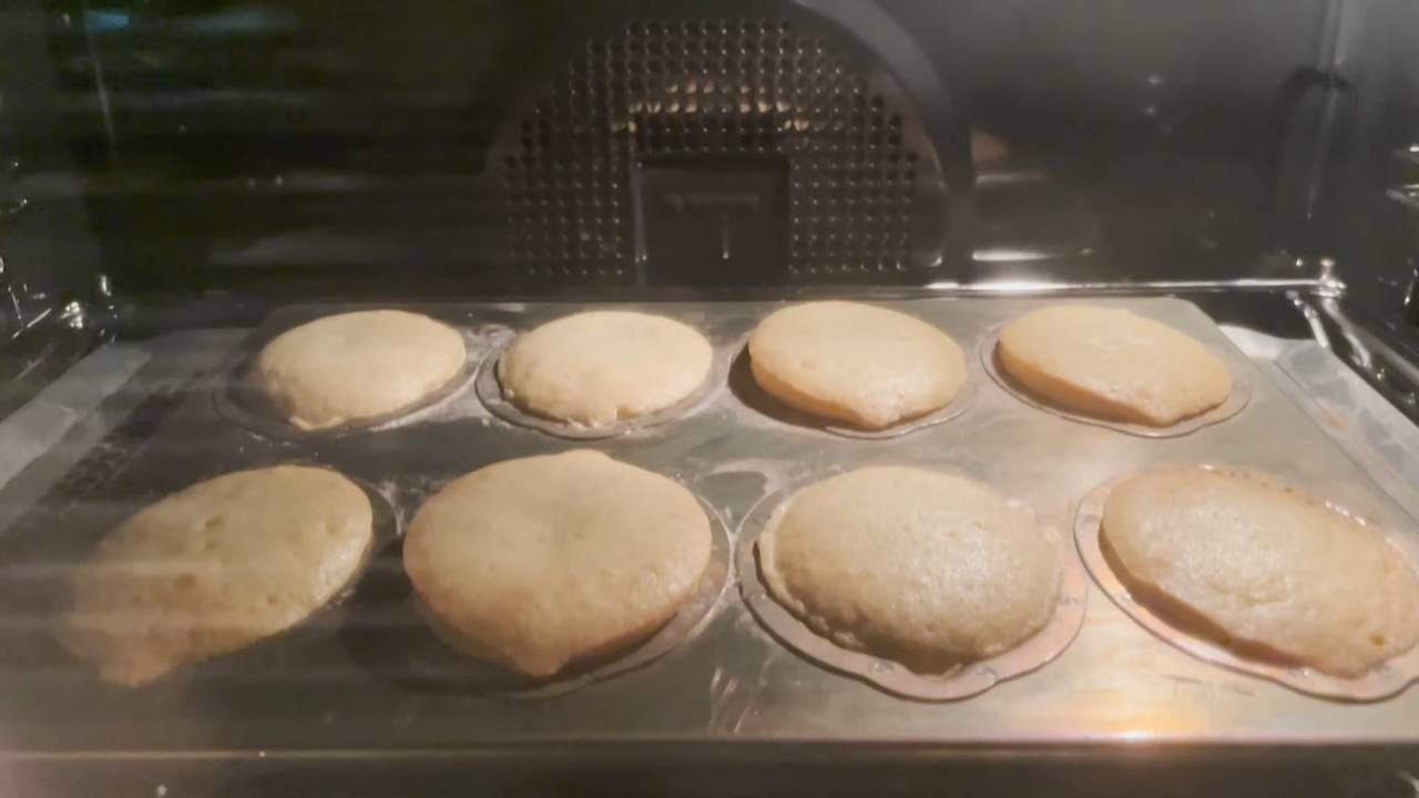 型を台に打ち付けて空気を抜き、170℃のオーブンで約30分間焼く。