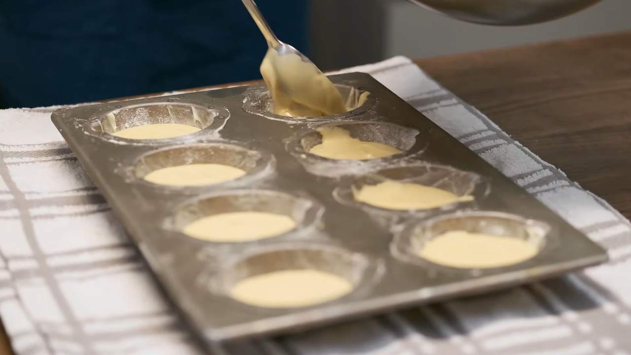 冷蔵庫から型を取り出して、スプーンで生地を流し入れる。- 6