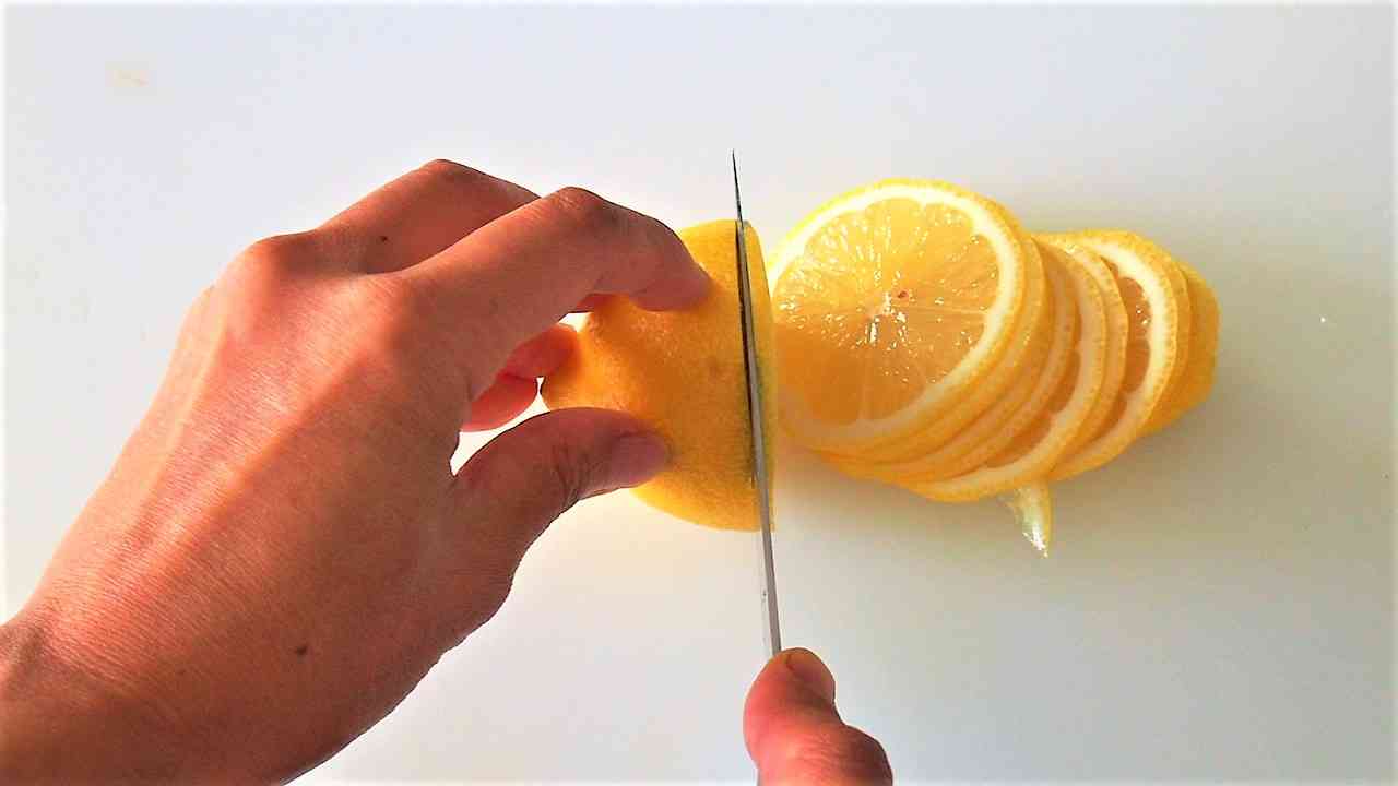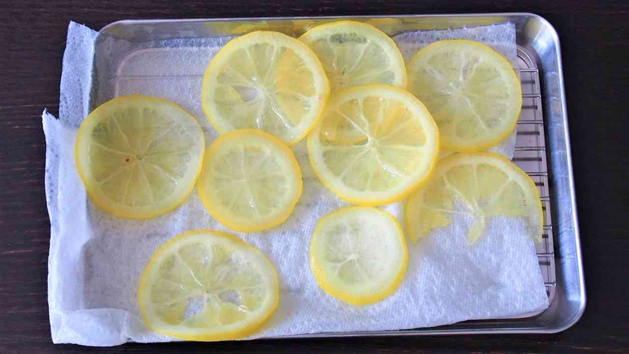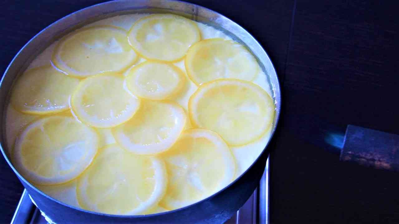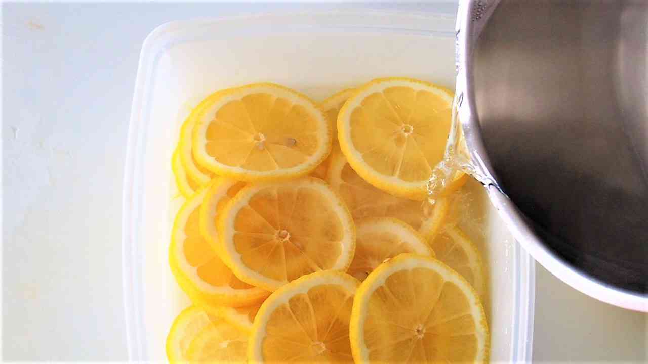 手鍋に砂糖と水を加えて沸騰させ、熱いうちにレモンに注ぎ1から2日ほどつけておく。