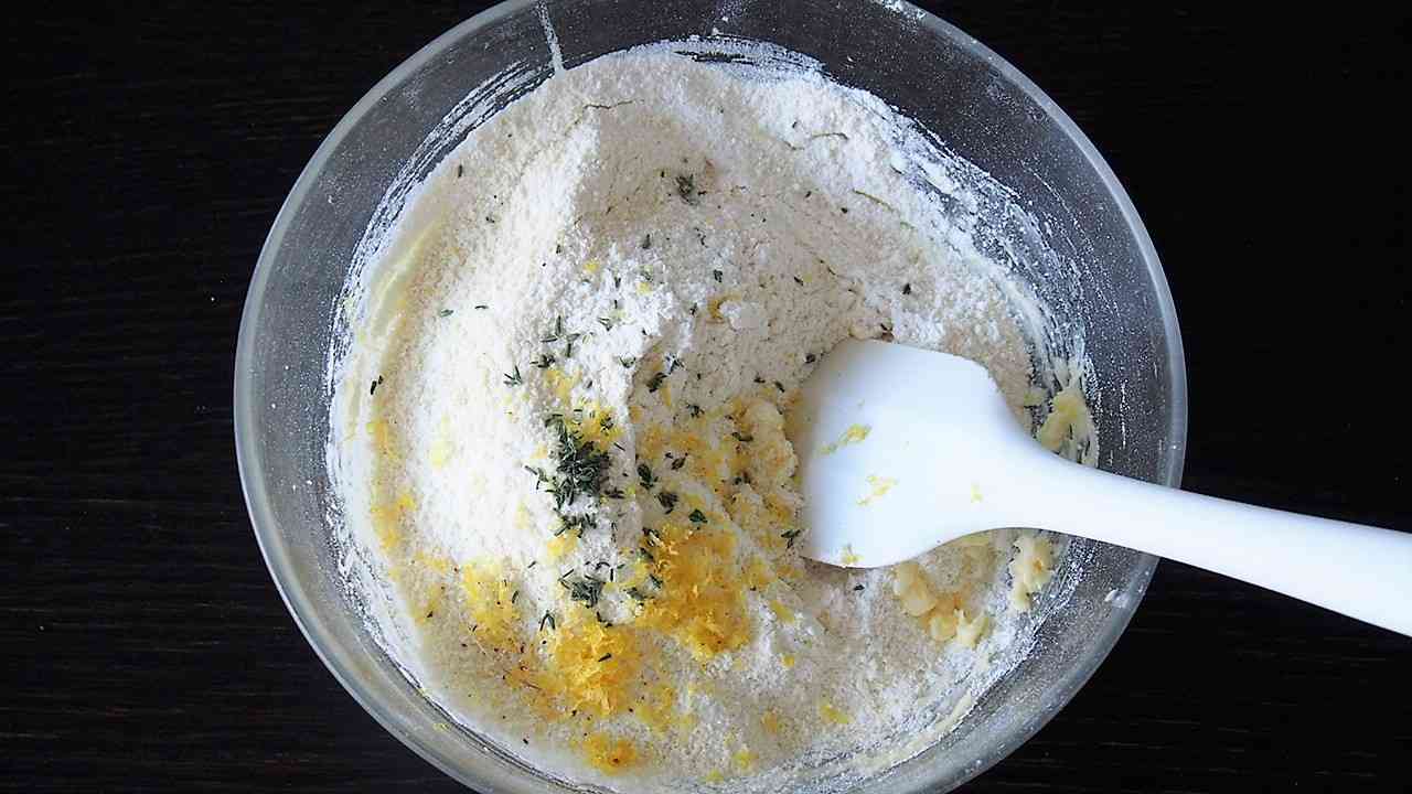 ふるった薄力粉とベーキングパウダー、アーモンドプードル、レモン皮、タイムを加え混ぜる。- 4