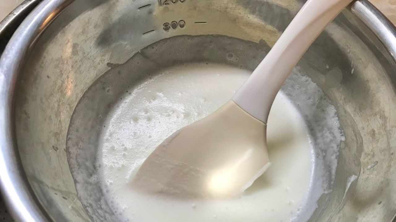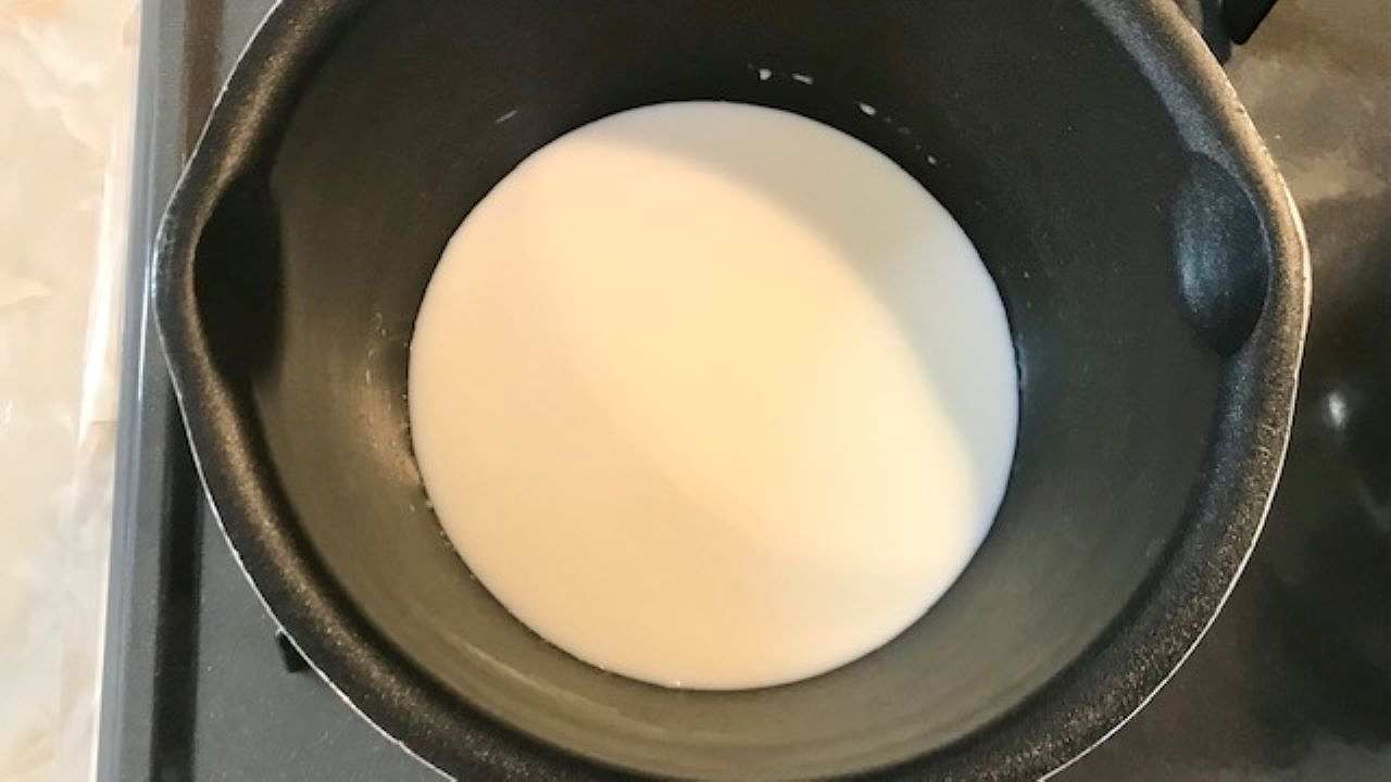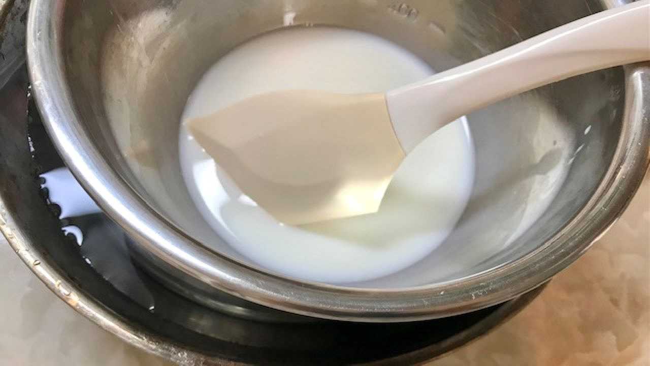 鍋に牛乳を入れて沸騰直前まで温めたら火を止め、ふやかしたゼラチン液を入れてしっかりと溶かします。