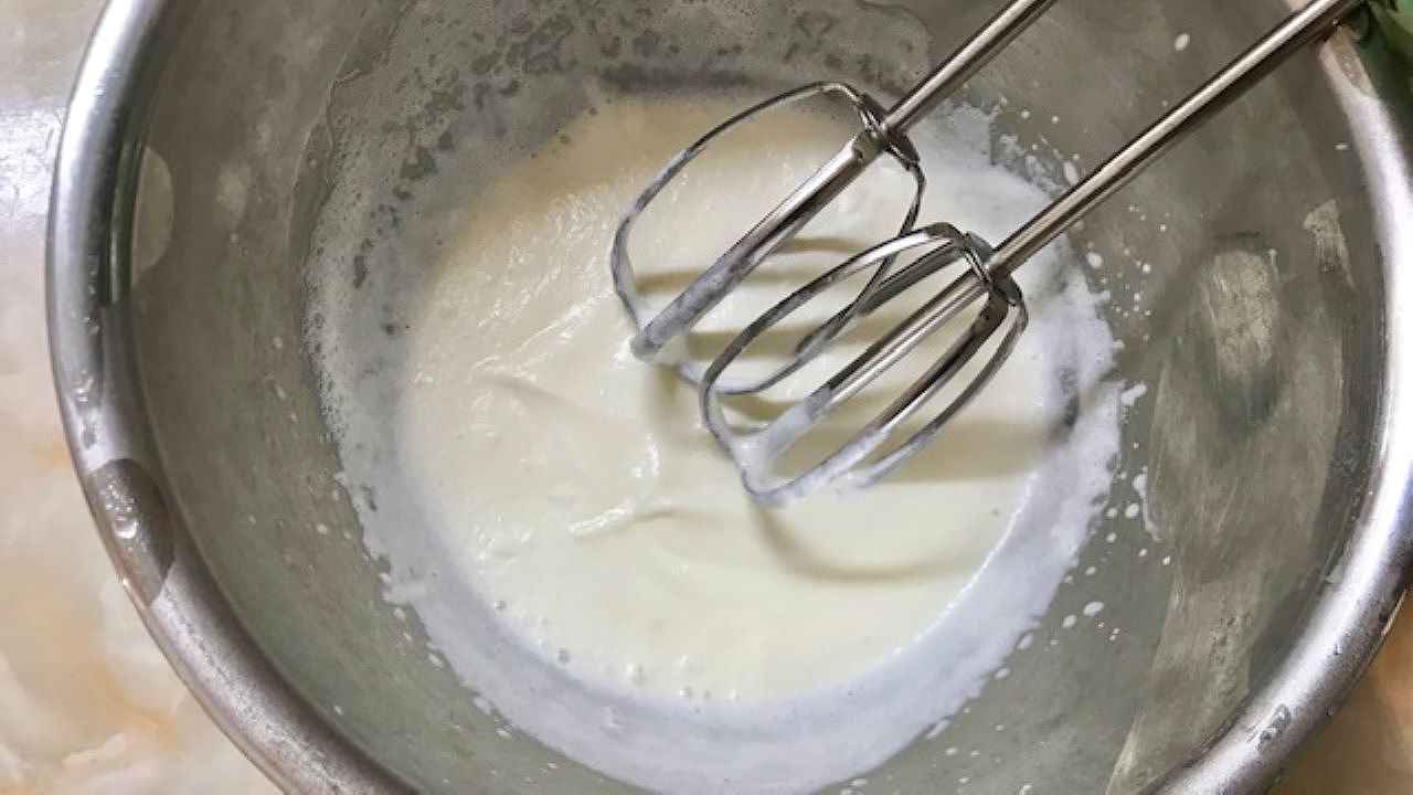 ボウルに生クリームを入れて、とろみがつくまで(6分立て)泡立てます。→冷蔵庫に入れておきます。