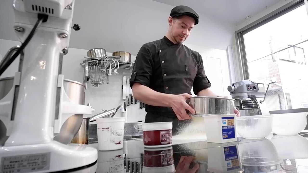 生地を少し広げるために天板を叩き、カカオパウダーを振る。