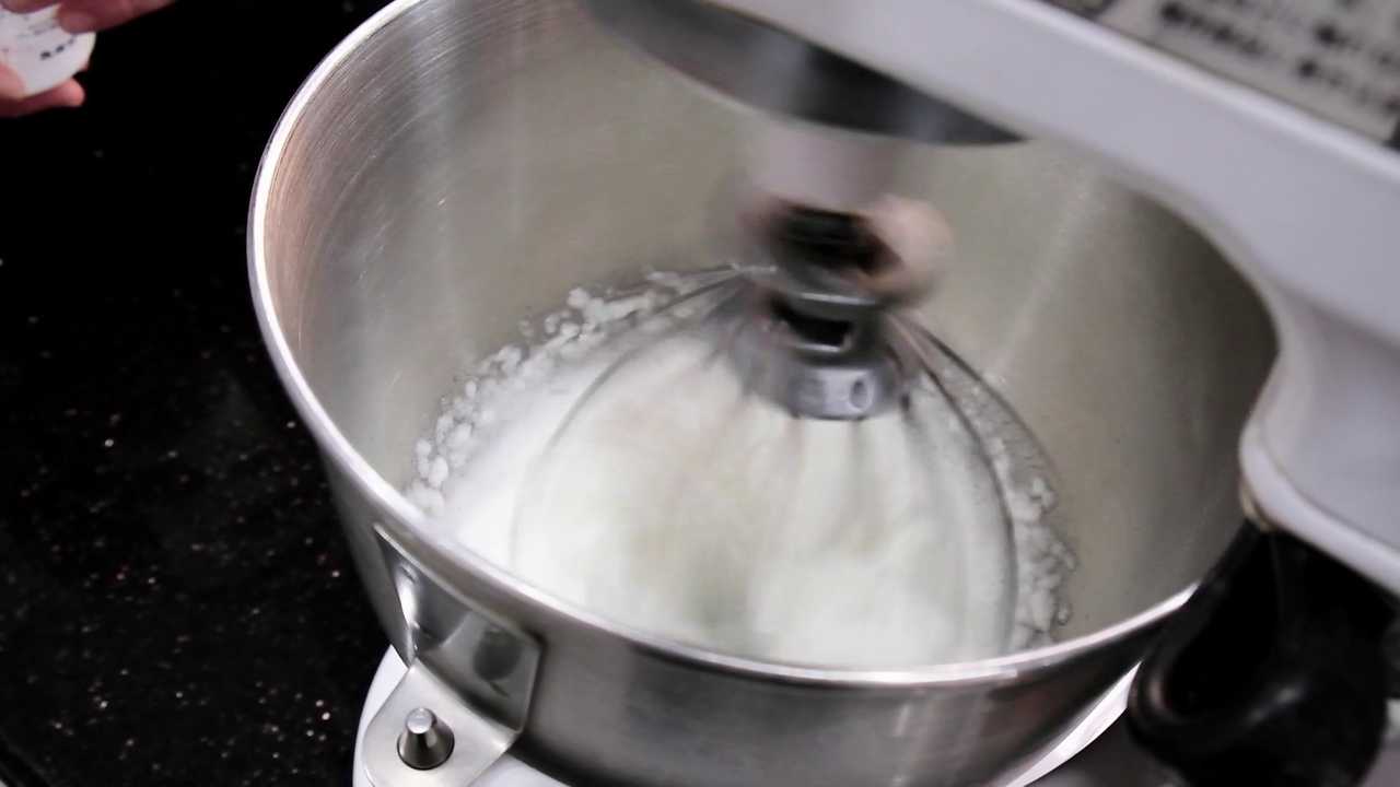 卵白に少し砂糖を加え、白いメレンゲを作る。