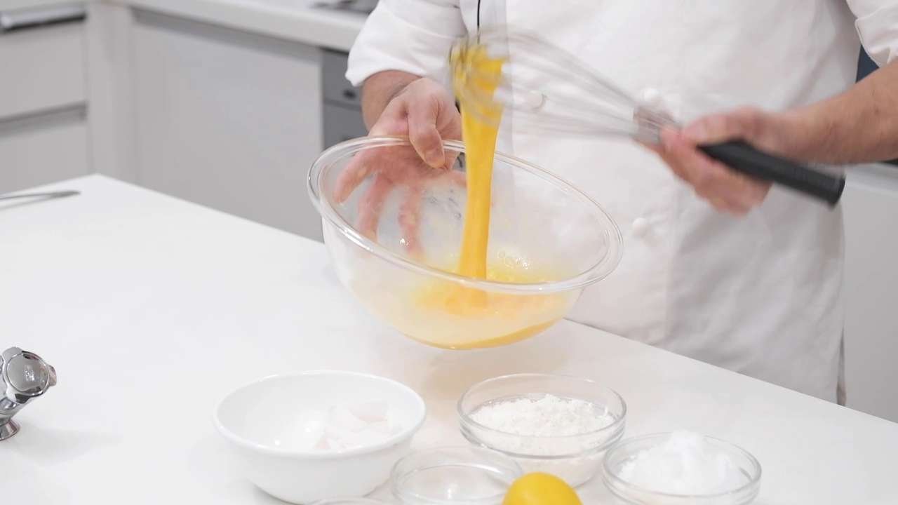 ボウルに卵、上白糖、はちみつ、レモンの皮を入れて、湯煎または直火で40℃程度に温めながら混ぜる。泡立てないように混ぜる。- 2