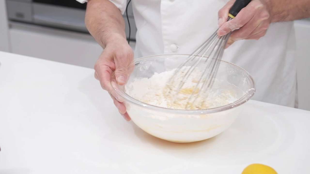 薄力粉、ベーキングパウダーを加えてしっかり混ぜる。- 3