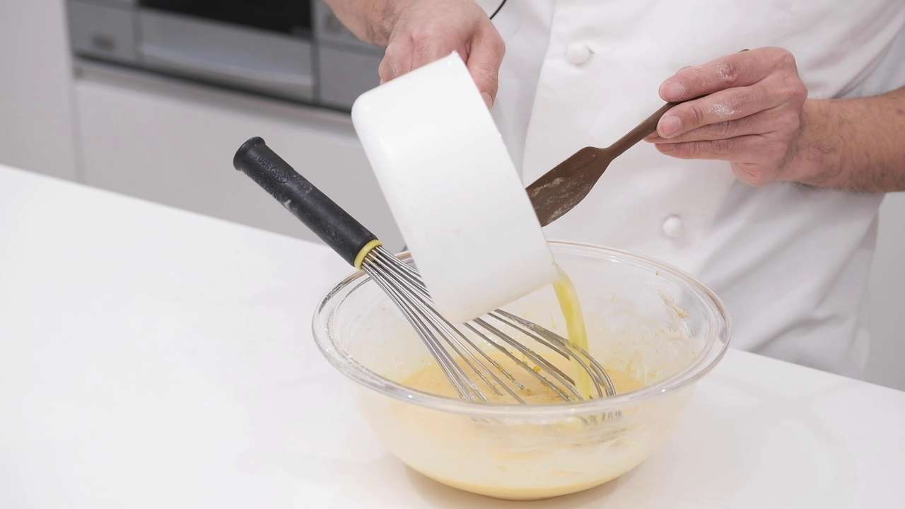 バターを60℃程度に温め、全体になじんだのを確認しながら2、3回に分けて加える。- 4