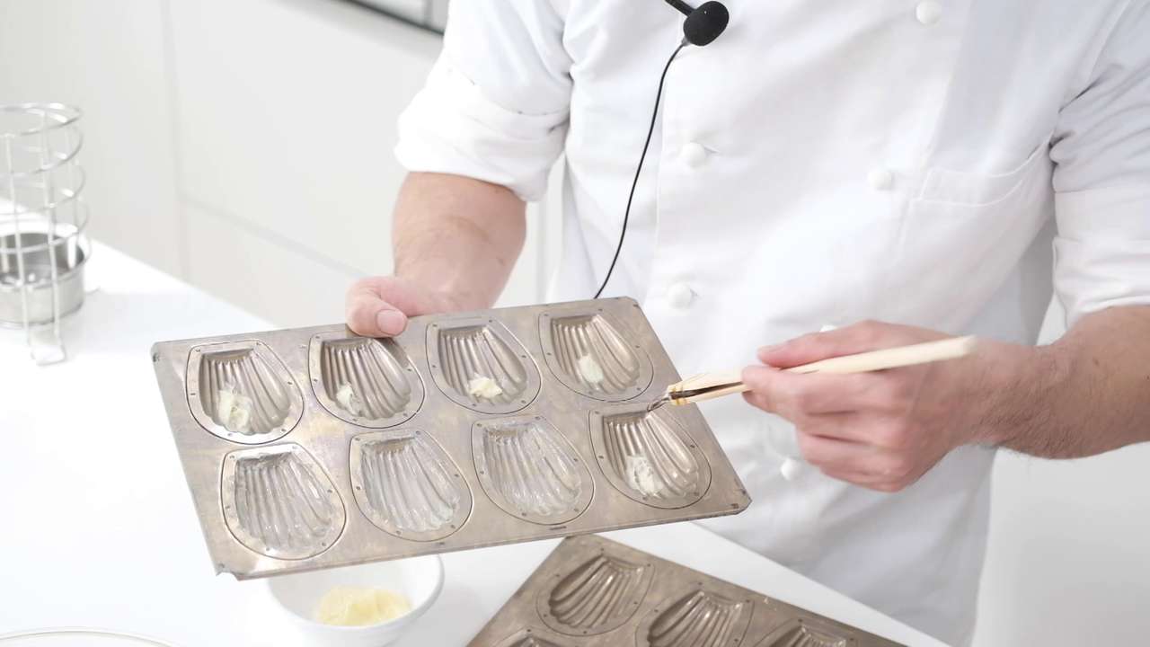 マドレーヌ型に、柔らかくしたバター(電子レンジ600wで5秒~10秒ずつ様子を見ながら行う)をはけで塗る。角にもしっかり塗る。冷蔵庫で5~10分冷やす。- 6