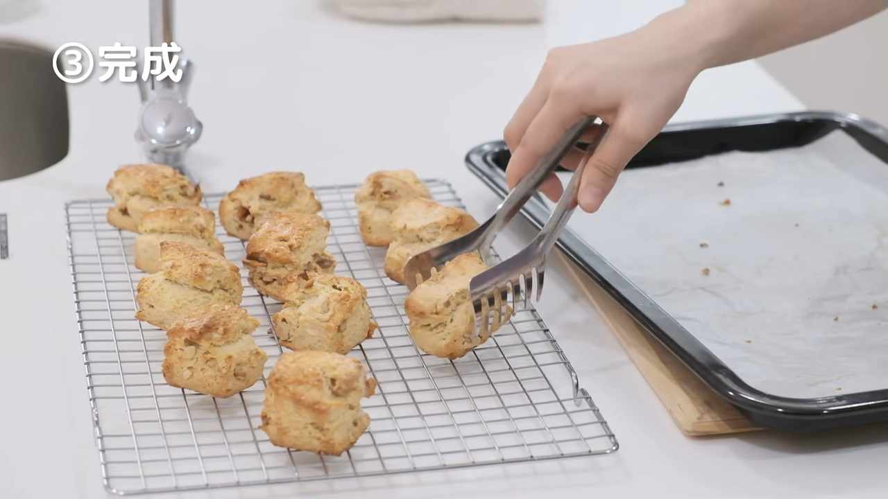 オーブンから出してすぐに網の上にのせ、蒸気で湿気らないようにする。温かいうちにいただく。