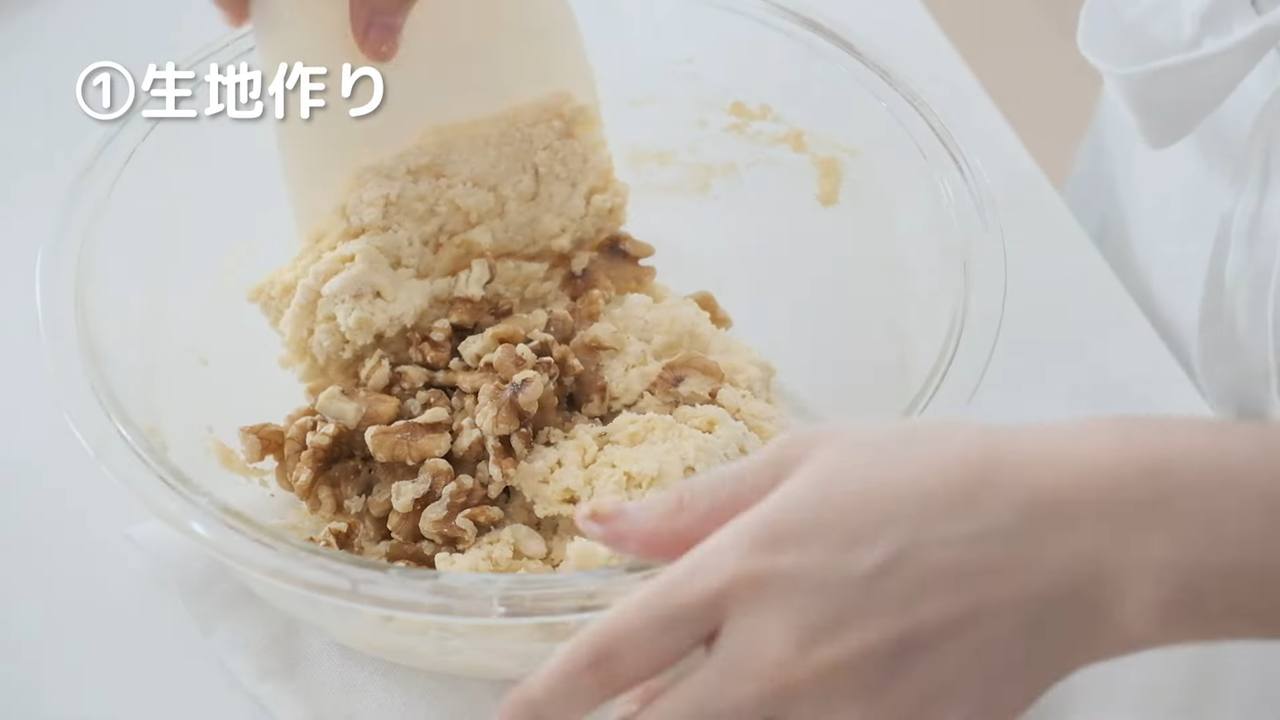 粉っぽさが残っているうちに、くるみを手で砕きながら加えて混ぜる。くるみは、大きめが好みの場合は砕かずに、小さめが好みの場合はあらかじめ包丁で切っておいてもよい。