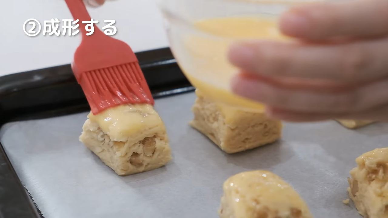 オーブンシートを敷いた天板に間隔を開けて並べ、溶き卵を塗る。