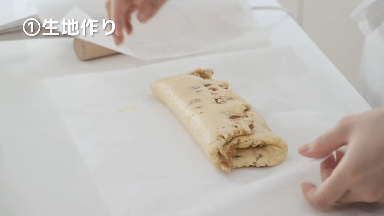 オーブンシートをはずして3つ折にし、麺棒でもう一度同じように伸ばす。再度3つ折りにして、冷蔵庫で20分以上冷やす。