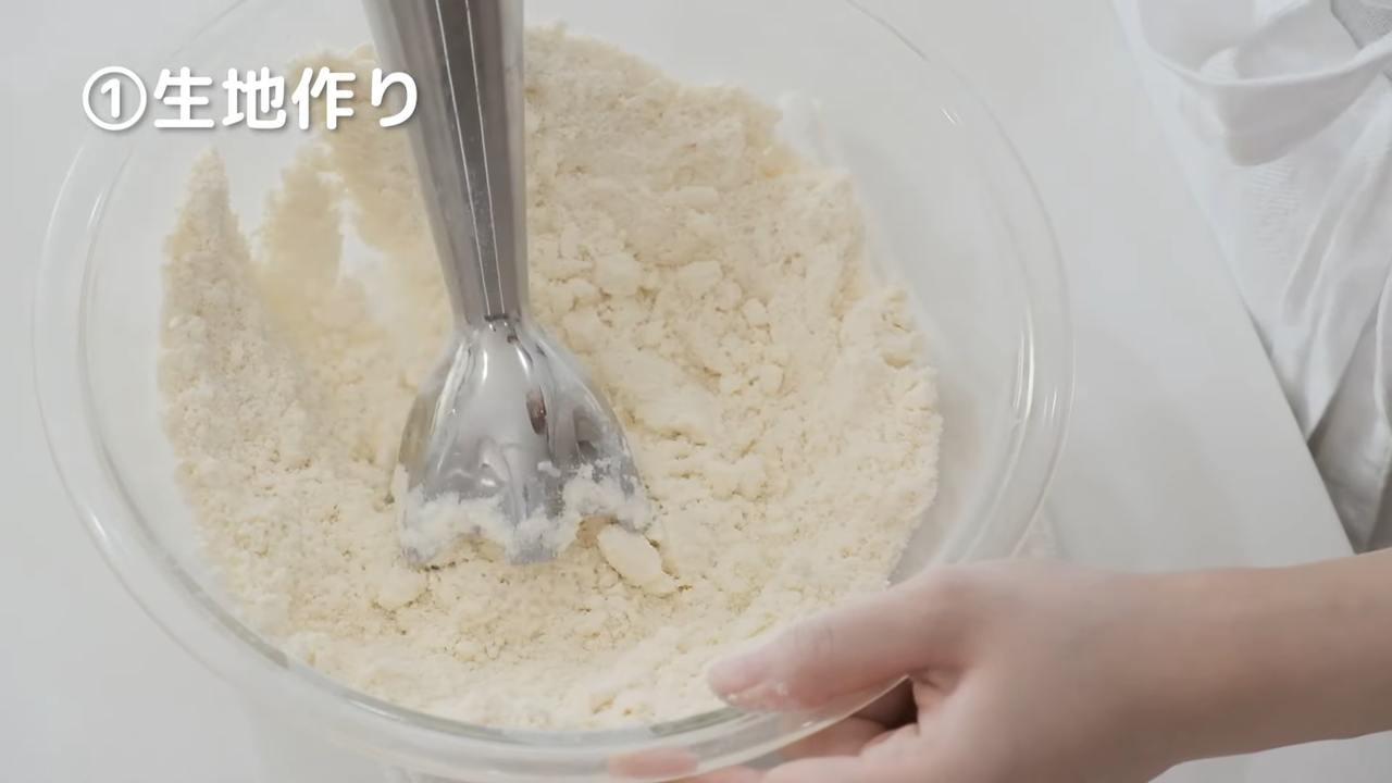 しっかり冷やしたバターを角切りにして加える。バターが全体に混ざって黄色っぽくなるまでハンドブレンダーで混ぜる。バターの塊が残っていたり粉っぽさがあっても気にしないでよい。