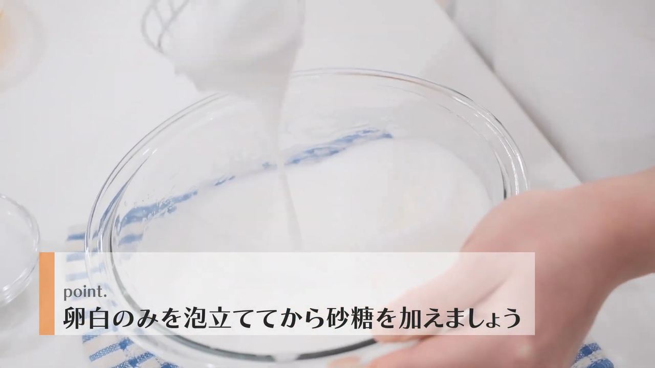 グラニュー糖を4回に分けて加えて泡立て、メレンゲを作る。- 5
