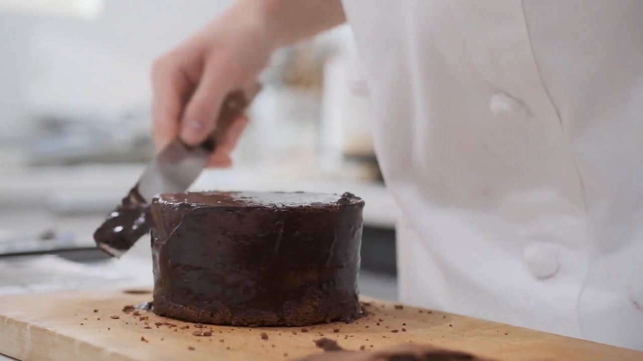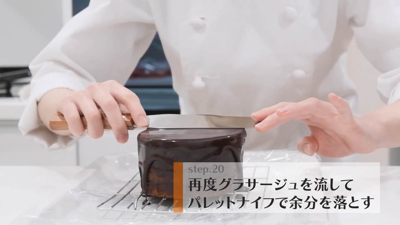 グラサージュを25℃位に調整して、パレットナイフで下塗りをする。上面を塗ってから側面を塗っていく。冷蔵庫で1時間冷やす。- 4