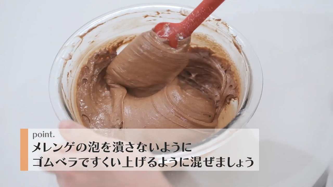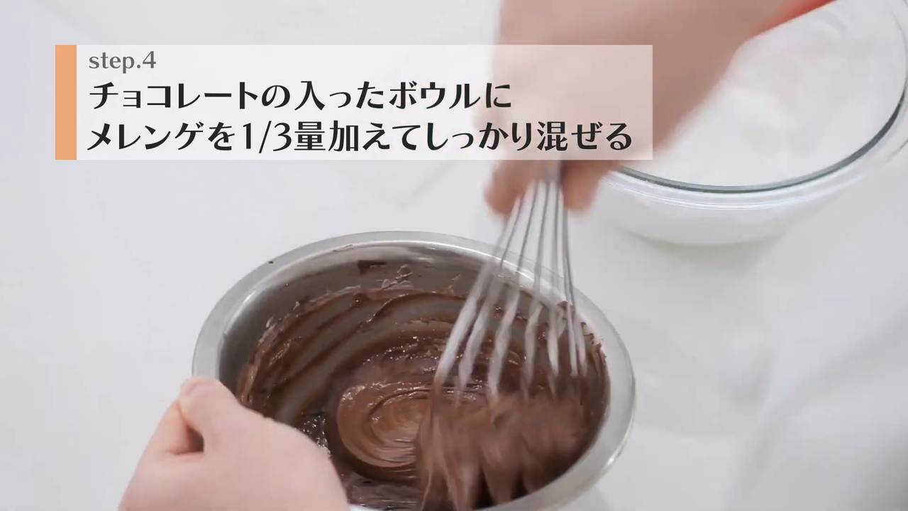 チョコレートの入ったボウルにメレンゲを1/3量加えてしっかり混ぜる。- 6