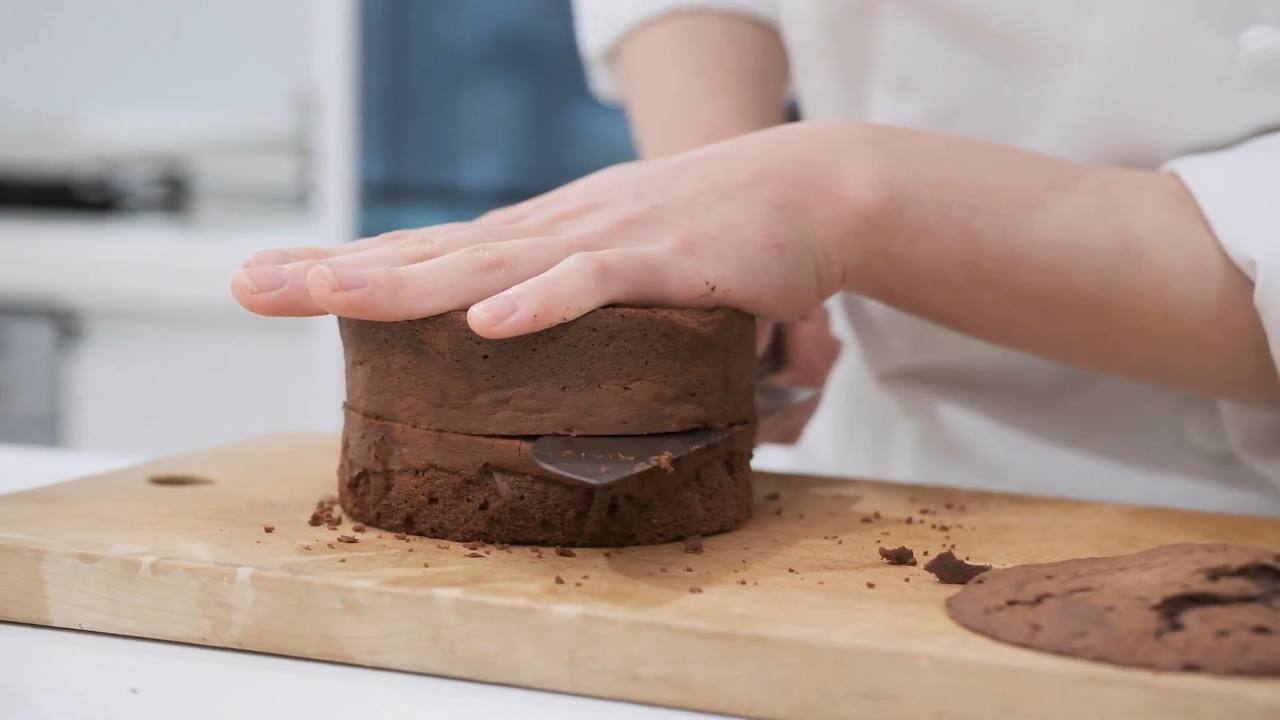 チョコレート生地の上面をスライスして、2枚にスライスする。